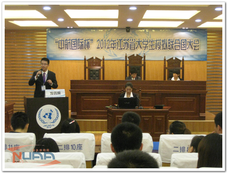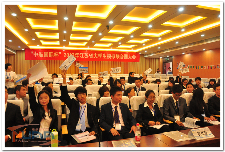 10月27日至28日,“中航国际杯”2012年江苏省大学生模拟联合国大会在我校顺利举行。江苏省少先队总辅导员、组委会荣誉秘书长姜东,共青团江苏省委组织部部长俞锋,江苏省学生联合会主席秦于安、驻会主席张婷与我校副校长吴庆宪出席了大会开幕式,校团委、教务处、学生处、星空影院 等部门和学院的负责人共同参加了大会。