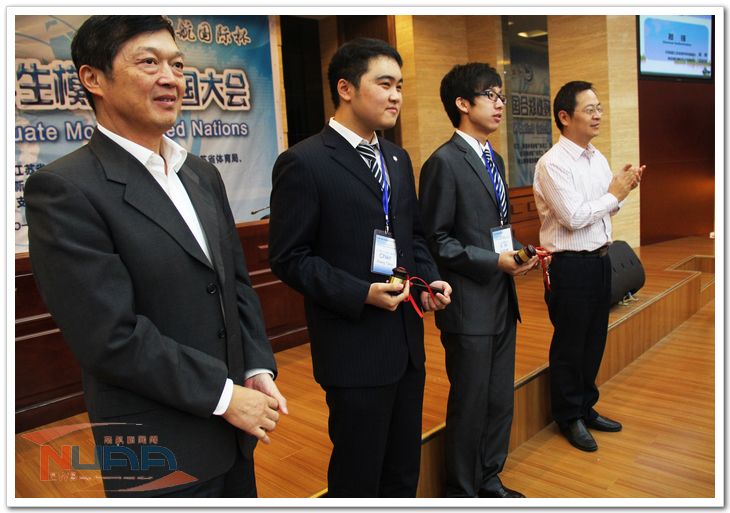 会议中,参会学生分别扮演着来自阿根廷、中国、巴基斯坦、美国等30多个国家或地区的外交官,身着正装,坐在会场中相应国家的指定席位,在主席团的主持下,通过演讲,自由磋商,有组织磋商等方式阐述“自己国家”的观点,为维护自己的“国家”利益发言,表现出了高度的专业精神和严谨作风。经过评委会和主席团的评定,南京财经大学关义春,我校江优雅获得了最佳代表称号,我校以及南京信息工程大学、淮海工学院、江苏大学共同获得了最佳组织奖。