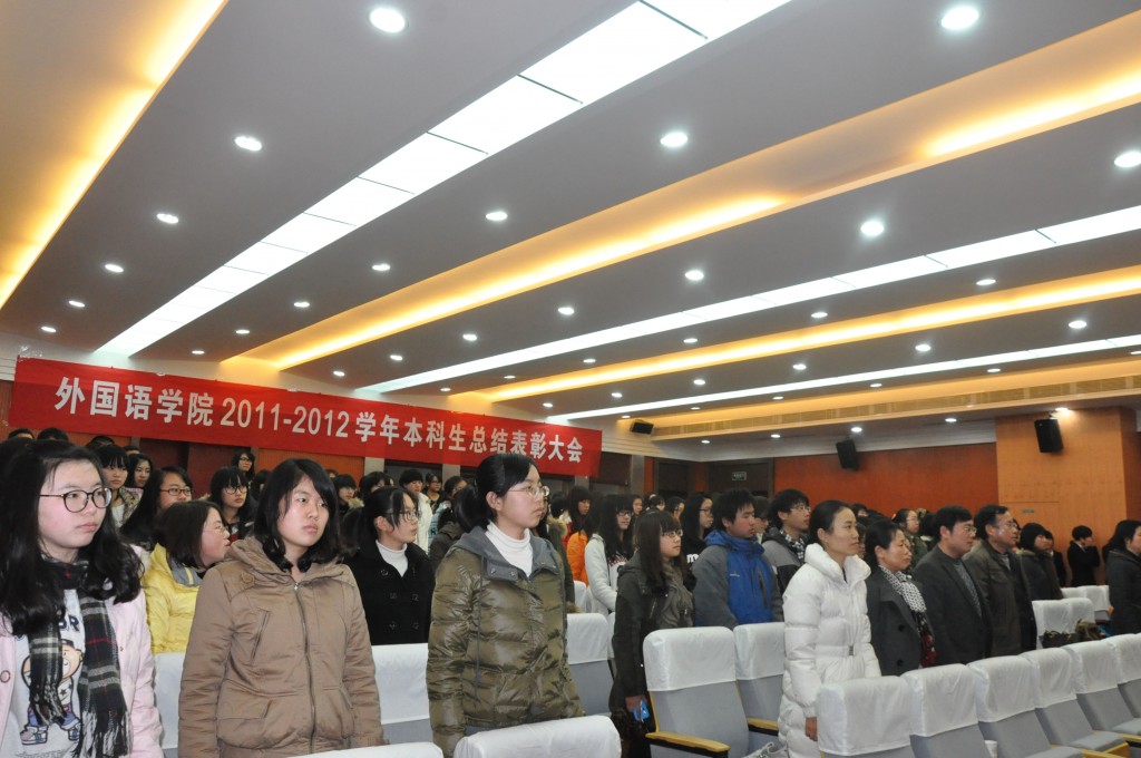 2011-2012学年本科生总结表彰大会在学院国际会议中心隆重举行。院党委书记刘健荣,院长何江胜,副院长谢小苑,院党委副书记庞小燕,英语系主任石云龙,日语系副主任窦硕华以及学院教师代表、班主任代表出席了大会,学院获奖学生代表、12级全体新生和其他学院优秀学生代表参会。