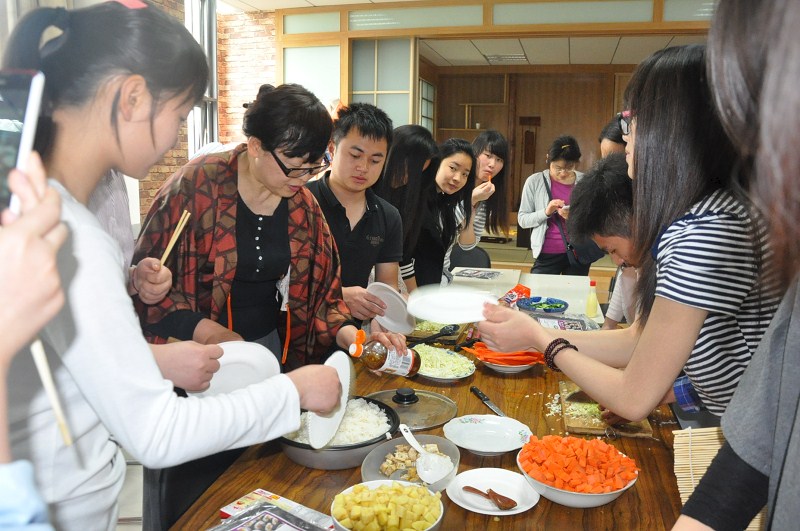 日式风格的榻榻米,半掩着的隔扇,犹抱琵琶半遮面的和服美人……伴着浓浓的日式氛围,日本料理的自然之味弥漫在学院大楼内。在两位老师的指导下,同学们亲自体验制作了寿司、日式咖喱、章鱼烧等日本特色美食。