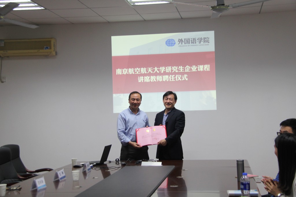 聘任仪式上,研究生院常务副院长江驹教授向庄怡武先生颁发聘书并发表了讲话,他指出企业课程是培养实践性人才的一次重要尝试,可以帮助学生提高行业所需相关技能和专业素养,更好更快适应社会需求,同时也为学校专业建设、教学模式改革拓展了发展思路。他希望此次校企合作能够不断推进,发挥校企双方优势,联合培养高素质应用型外语人才。