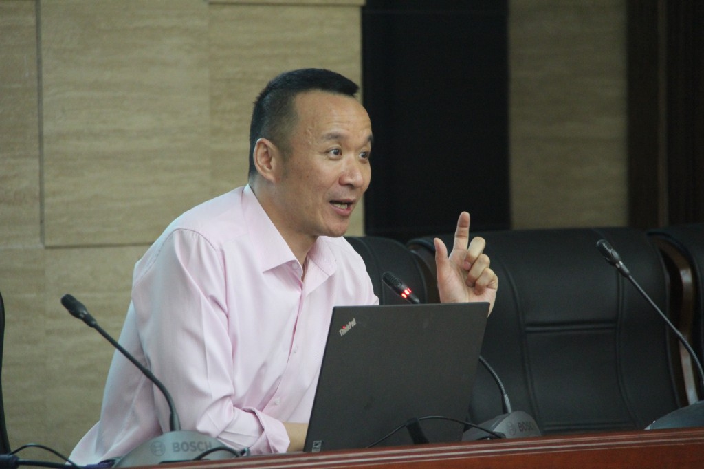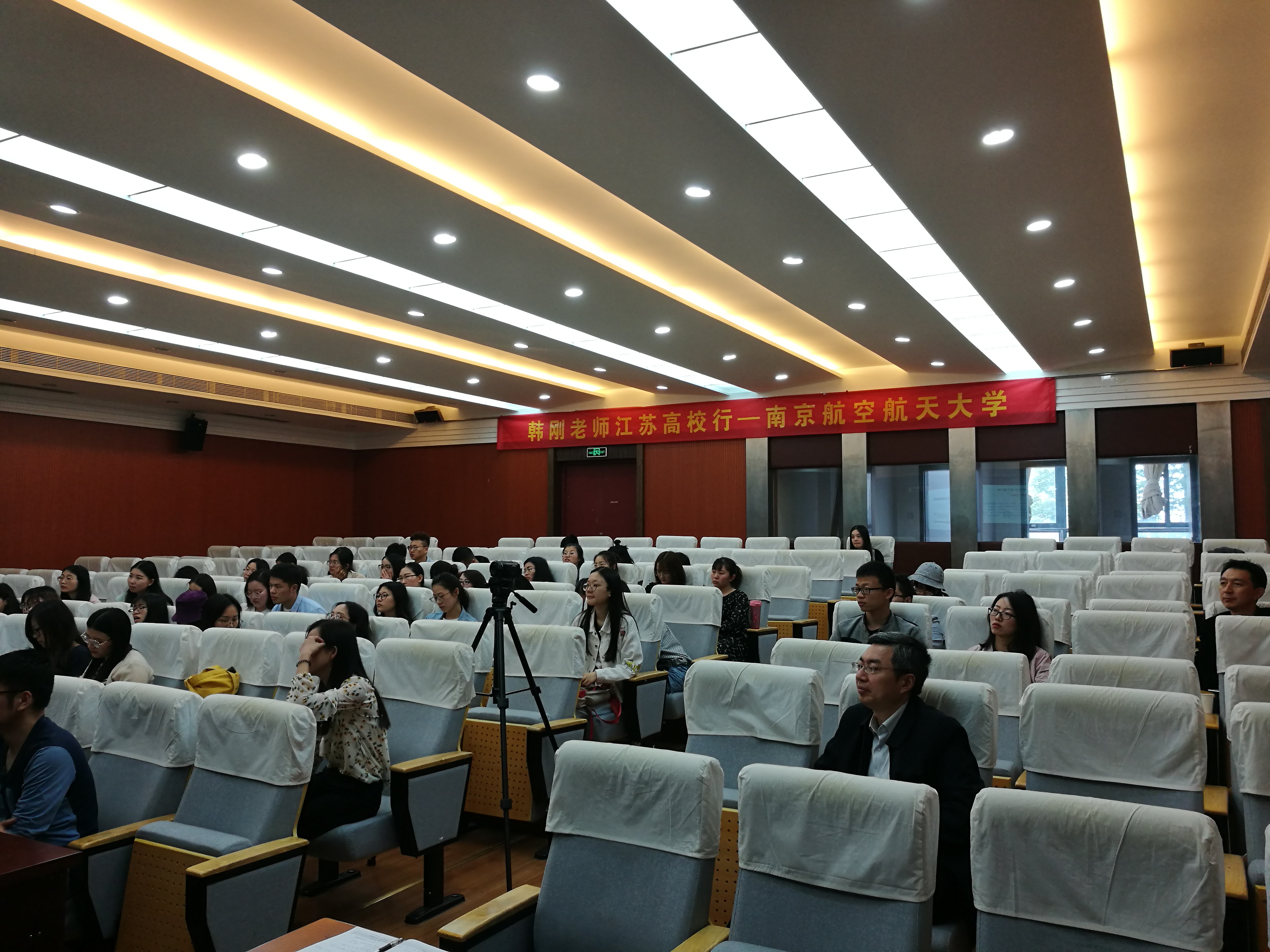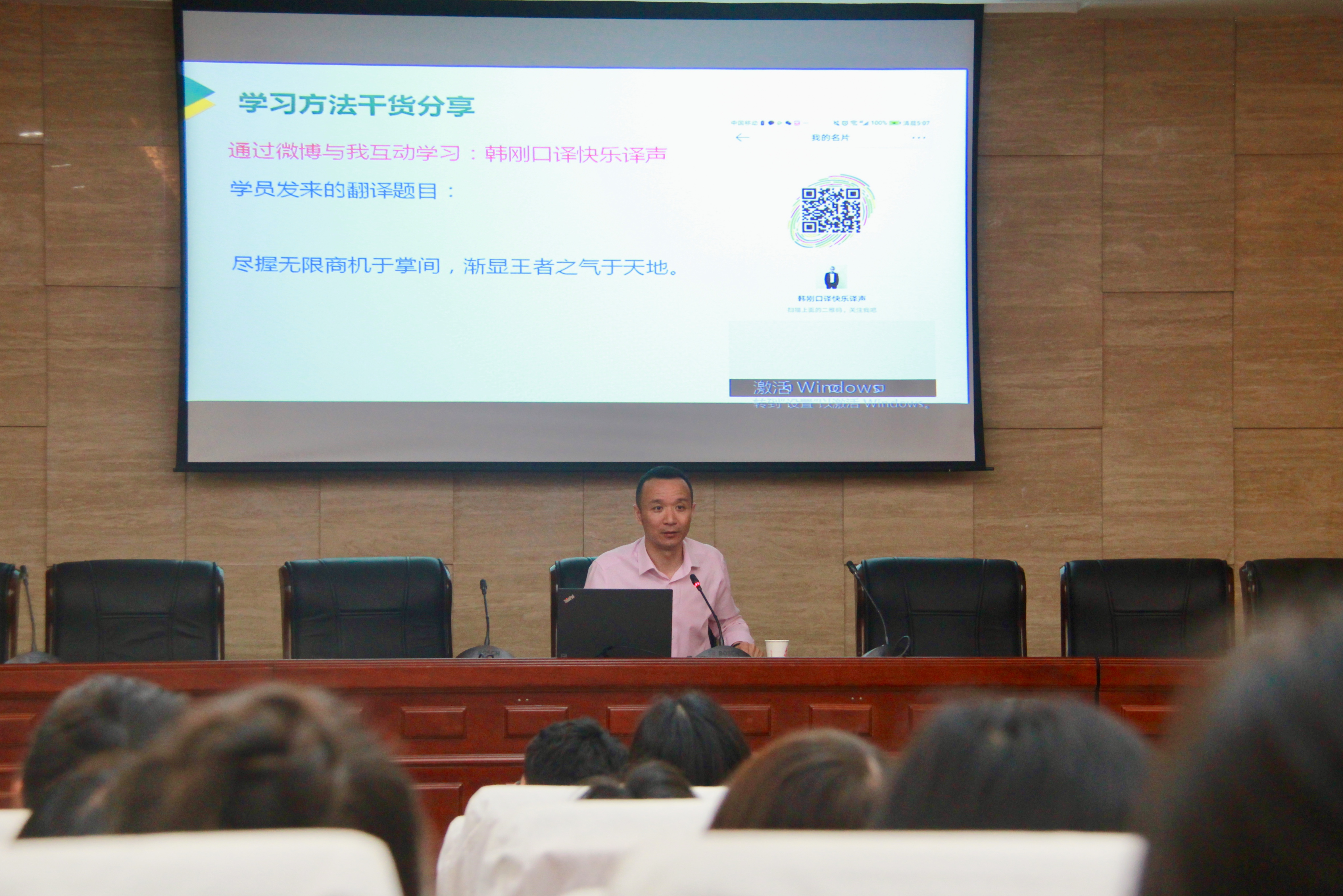 2018年4月20日上午,国内著名翻译培训教育家、前外交部新闻司首席同传韩刚老师应邀在外国学院国际会议中心做了题为“‘译’路顺风:揭秘‘国家队’翻译套路,助力英语学习就业”的讲座。讲座由星空影院 MTI教育中心主任鲍德旺副教授主持,这是一场翻译实战经验分享的盛宴。学院多名教师、翻译专业研究生、英语专业本科生及远道慕名而来的韩刚老师的粉丝们积极参加了此次讲座。