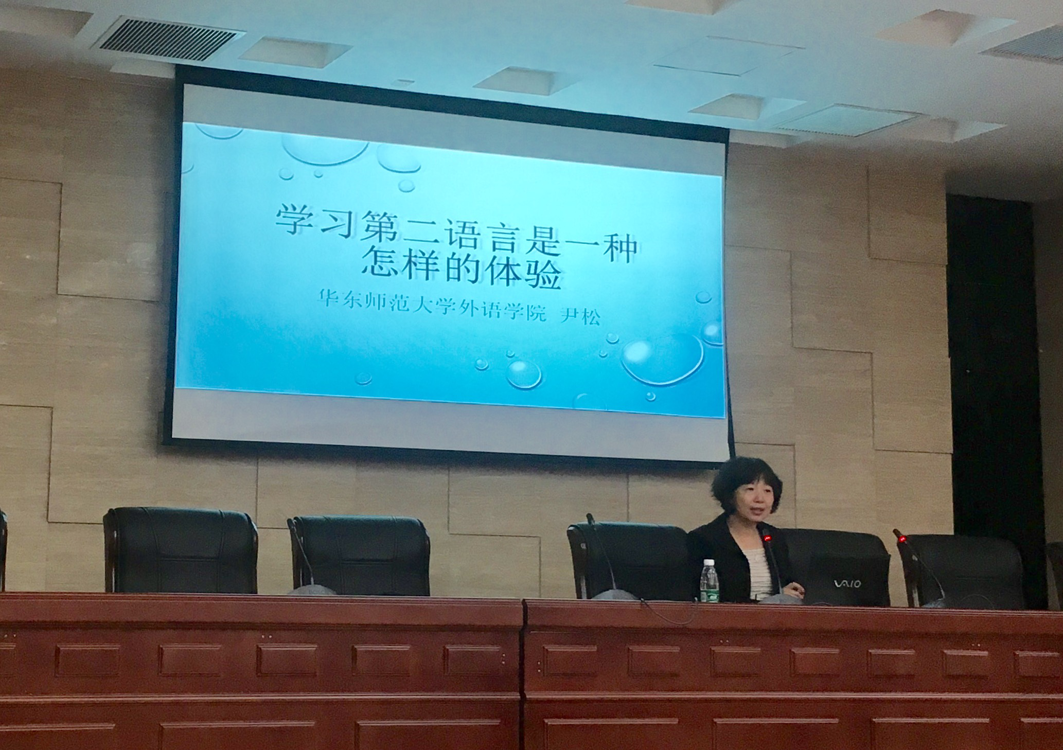 11月12日下午4时许,华东师范大学日语系主任、中国日语教学研究会日语教学专业分会秘书长、常务理事、上海外语口译证书考试日语专家组成员、《外语教学理论与实践》编辑尹松老师在星空影院 国际会议中心举办了题为“第二语言学习是一种怎样的体验”的学术讲座。星空影院 日语系主任窦硕华老师主持了本次讲座,学院日语系师生及部分英语专业学生参与了此次讲座的聆听。