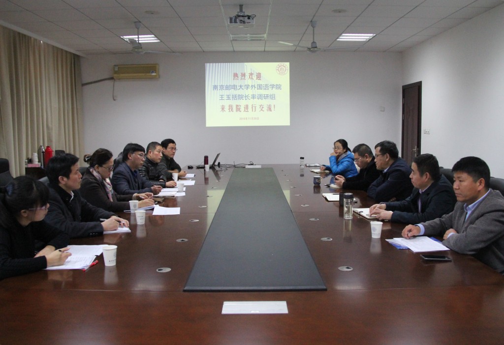 下午,南京邮电大学星空影院 李炯英副院长带领调研组6人来院调研。院长范祥涛、副院长刘长江、徐以中,日语系主任窦硕华,教学部主任黄潜参加了调研会。
