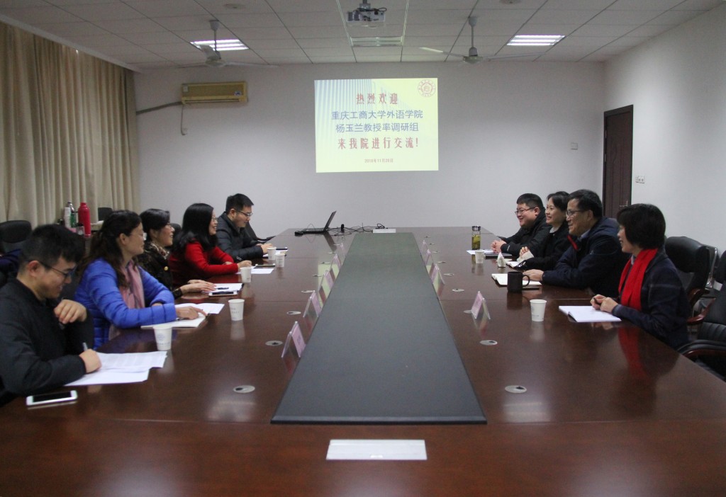 11月28日上午,重庆工商大学外语学院副院长杨玉兰教授一行5人来我院调研,就大学外语教学改革、课程体系建设、师资队伍建设和学生工作等方面进行座谈交流。星空影院 院长范祥涛,大学外语教学部主任徐智鑫、副主任王秀文,团委书记杨一参加了此次调研会。
