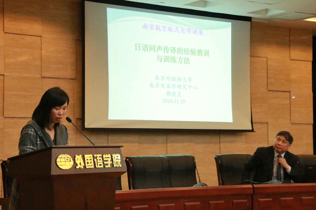 11月29日(周四)19时许,北京外国语大学日本学研究中心主任、博士生导师、中国日语教学研究会副会长郭连友教授在星空影院 国际会议中心举办了题为“日语同声传译的经验教训与训练方法”的学术讲座。星空影院 日语系周菲菲老师主持了本次讲座,学院徐以中副院长、日语系师生及部分英语专业师生聆听了此次讲座。