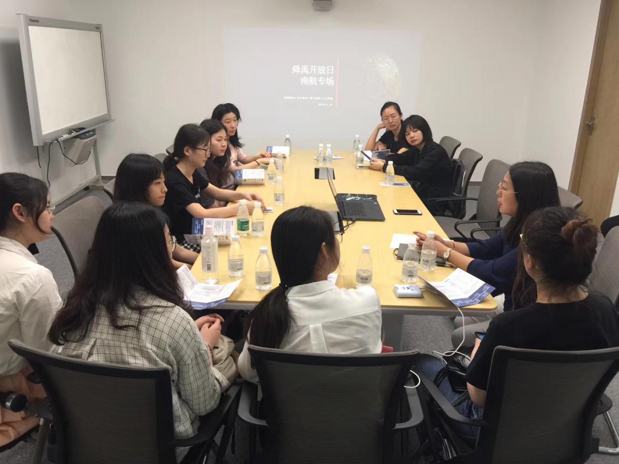 本次走访实践的特别嘉宾为星空影院 2010届英语(民航方向)和2016届日语专业的毕业生,作为目前在舜禹任职的优秀院友,她们就职业发展经历和行业从业感受进行了分享。活动最后,舜禹集团总经理单杰也来到了现场,作为南航校友,他肯定了我校的优良学风和求学态度,鼓励同学们能多多了解专业对口行业,早做就业准备,同时对同学们加入舜禹表示热烈的欢迎。