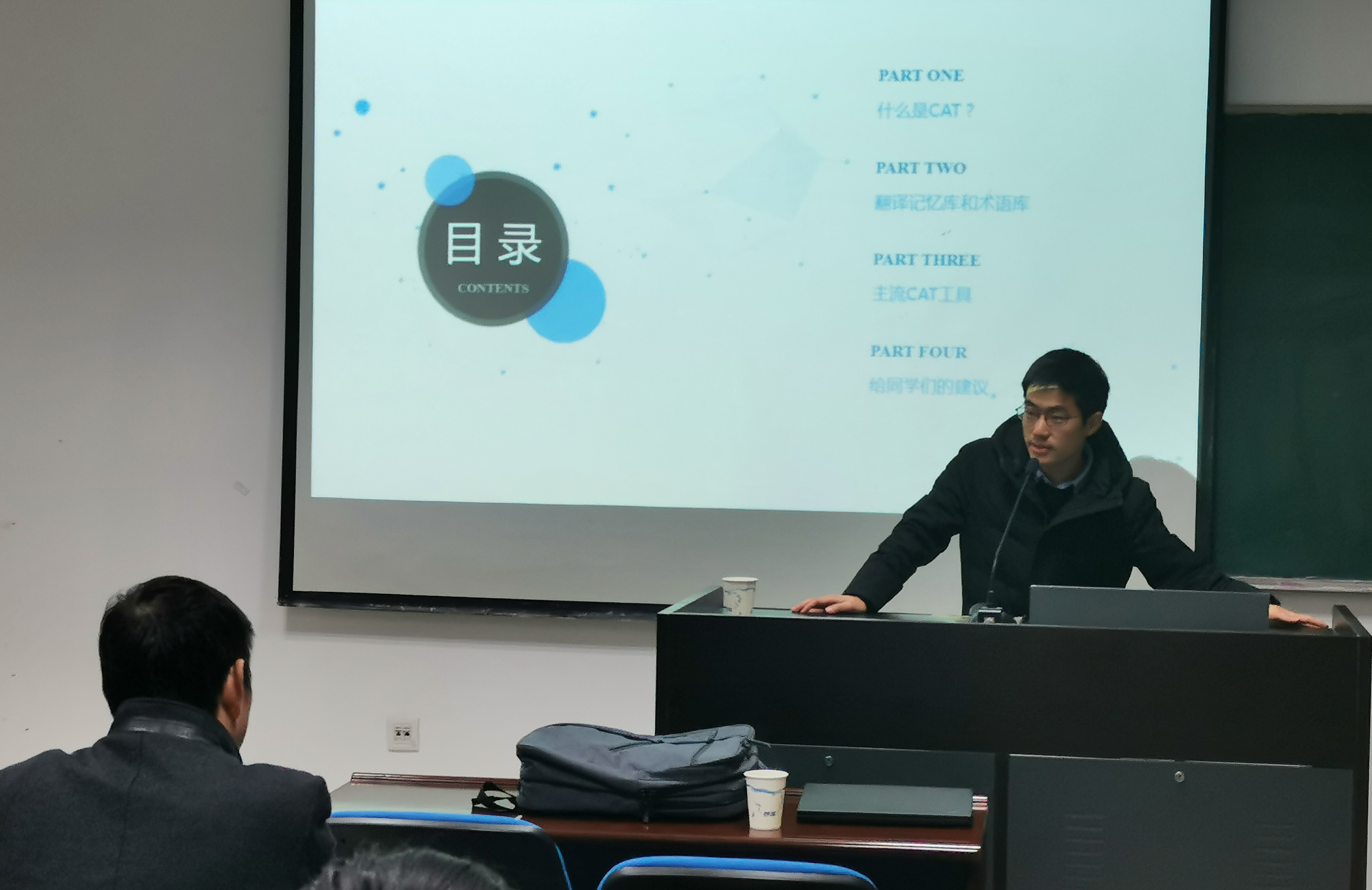 在111教室举办了题为“计算机辅助翻译技术”和“科技翻译技巧与常见错误分析”系列讲座和论坛。报告人分别为Tmxmall运营经理陈世遥先生与王莹女士、润桥翻译公司总经理陈益群先生。讲座由学院MTI教育中心主任鲍德旺老师主持,副院长徐以中及部分专业教师,2018、2019级部分研究生参加了论坛。
