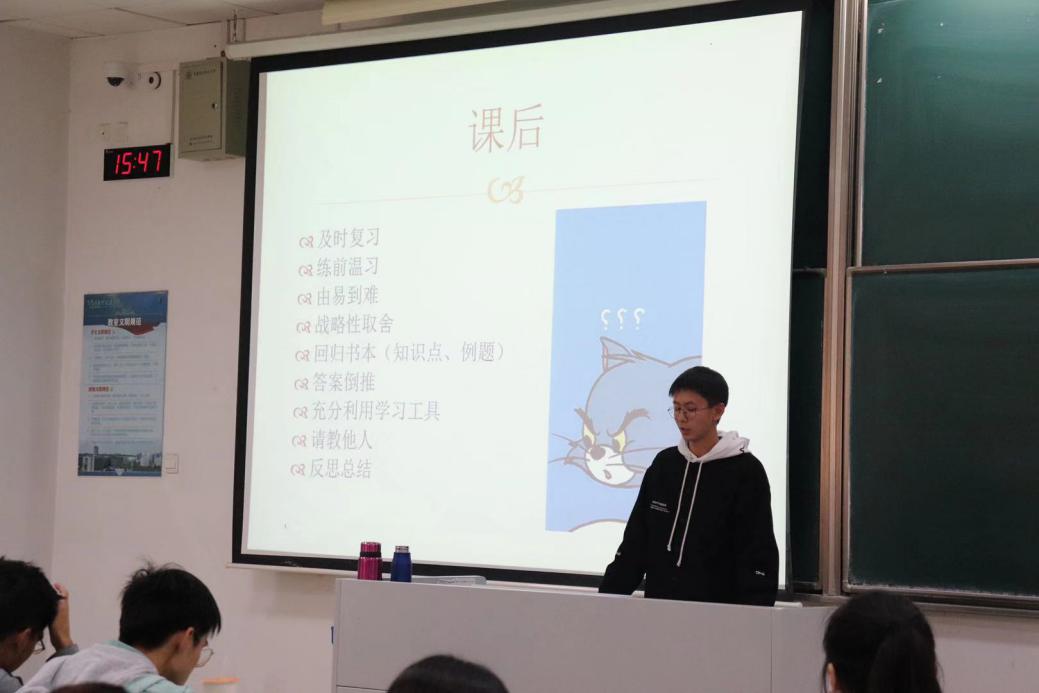 随后,针对高数学习中的共性问题,年级中心组学习部部长韩鹏进行了学习经验分享,与大家共同探讨高数学习方法以及如何合理规划学习时间。为了更好地解决高数学困问题,2019级年级中心组联合学院青协组建了高数期末考试冲刺班,由高数成绩优异的学生担任“教员”,每周进行集中高数辅导,在全院营造“你追我赶,你帮我带”的浓厚学习氛围。