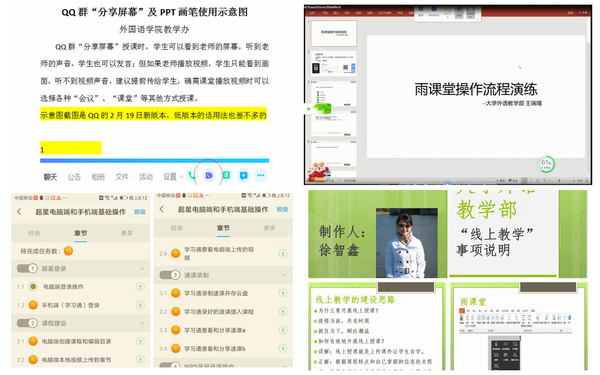 2月24日,开学第一天,老师们有备而来,从容步入云课堂,上课模式精彩纷呈,每个人都在雨课堂、学习通、QQ分享屏幕、腾讯课堂、腾讯会议、ZOOM、微信群、QQ群中找到了适合自己的最佳组合。