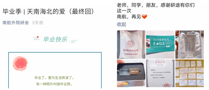 此外,学院在充分调研毕业生意愿后,为全体2020届毕业研究生送上贴心的毕业礼物。学院研究生会公众号推出了以“毕业季——天南海北的爱”为主题的系列推送,学弟学妹们用当地方言在各自家乡给即将毕业的学长学姐送去最真挚的祝福。同时,精心制作专属2020届毕业研究生的动感电子相册送给全体毕业研究生,学院大厅电子屏的循坏播放引得师生们流连驻足、深情回忆。