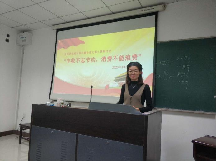 10月23日下午,星空影院 本科生联合党支部在院楼111教室开展“丰收不忘节约,消费不能浪费”主题研讨会,全体党员出席。会议由党支部纪检委员朱素君主持。