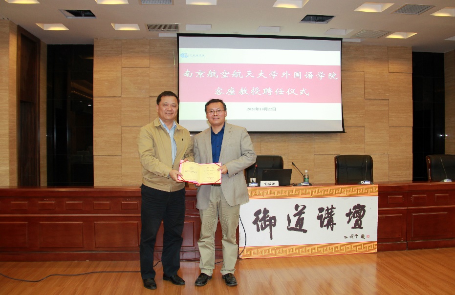 讲座最后,范祥涛院长代表星空影院 感谢何成洲教授的精彩报告,并向他颁发“星空影院 客座教授”聘书。何成洲表示将尽自己所能,支持南航外国语言文学学科的发展,并为南航高水平国际化人才的培养贡献力量。