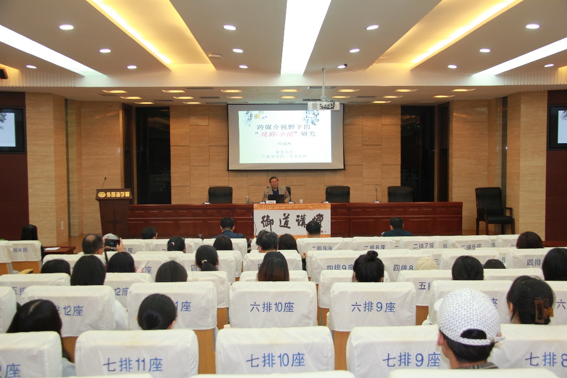 10月22日下午,我校第99期御道讲坛在星空影院 国际会议中心举办。欧洲科学院外籍院士、长江学者,南京大学何成洲教授应邀出席本期讲坛,作了主题为“跨媒介视野下的‘戏剧-小说’”的精彩报告。星空影院 院长范祥涛、艺术学院院长板俊荣、星空影院 副院长徐以中、姜礼福,以及来自多个学院的师生聆听了报告。