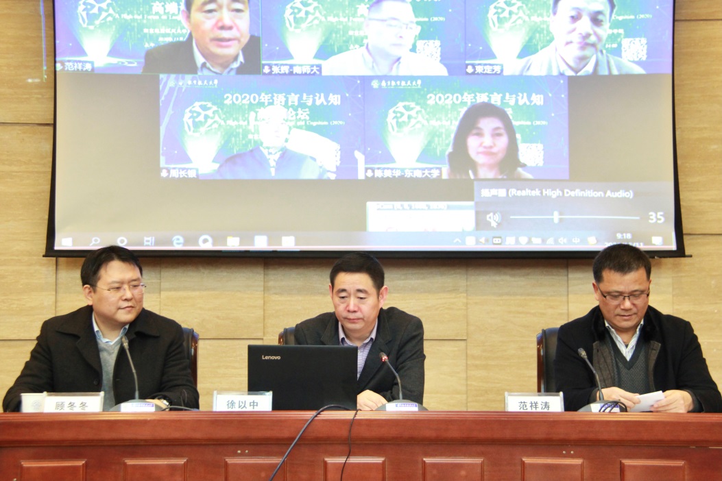 本次论坛为期一天,分上下午两场举行。上海外国语大学束定芳教授、西南大学文旭教授、南京师范大学张辉教授、广州外语外贸大学冉永平教授、南京大学陈新仁教授、湖南大学刘正光教授、对外经贸大学向明友教授、山东财经大学李毅教授、北京第二外国语大学周长银教授等语言学领域的顶级专家作了主旨发言。东南大学陈美华教授、南京师范大学倪传斌教授、南京师范大学王永祥教授、扬州大学王金铨教授分别主持上午和下午的论坛。专家们在报告中探讨了当下语言学研究中值得关注的热点问题,就语言与认知实验研究的目标与课题、类比思维与视觉隐喻、语言理解范式下英语二语概念数效应的ERP研究、社会-认知语用视角下的交际语境观、言语互动中“没别的意思”的元语用解读、时间性与语法标记的关联模式、语言学研究的经济视角、中国学习者英语习语加工的ERP研究、中国学生对汉语“把”字句中角色错配动结式和英语角色颠倒结构加工的ERP研究等专题展开了探讨。