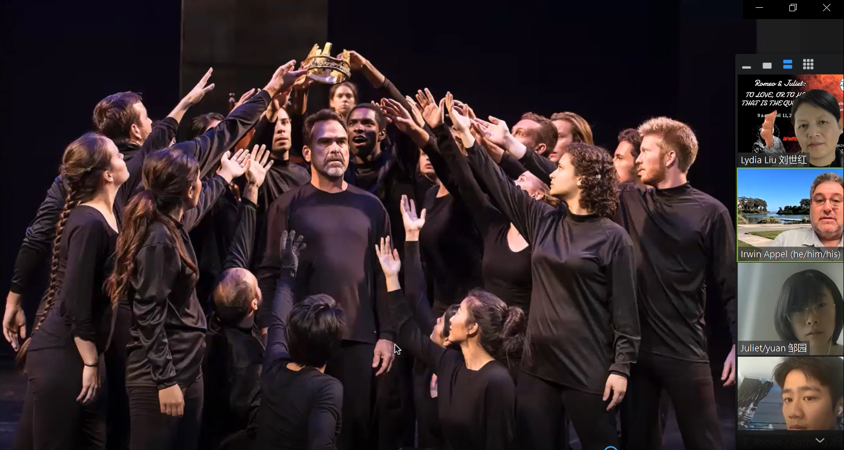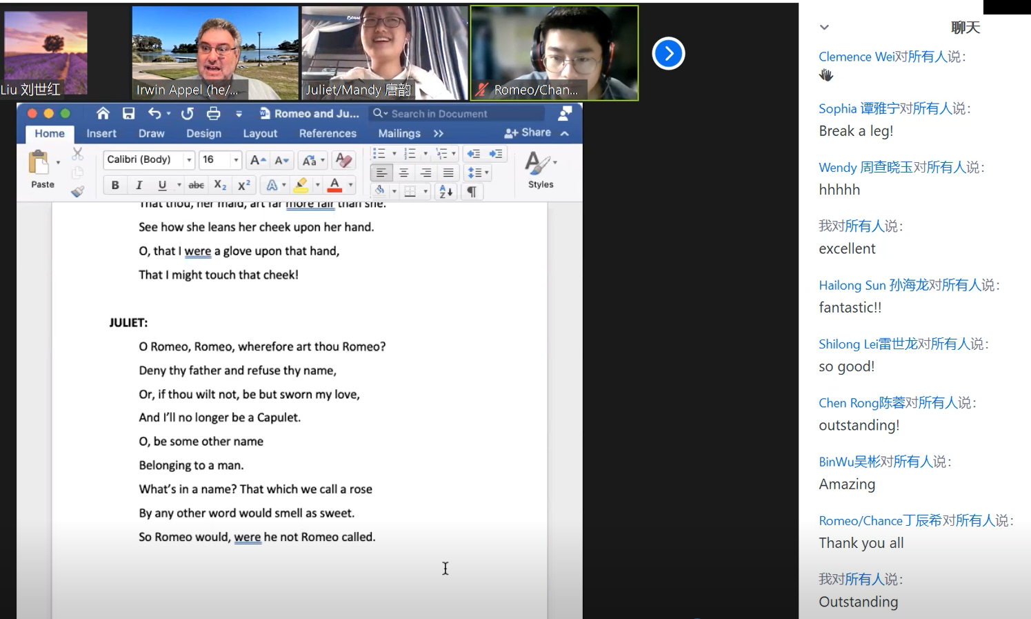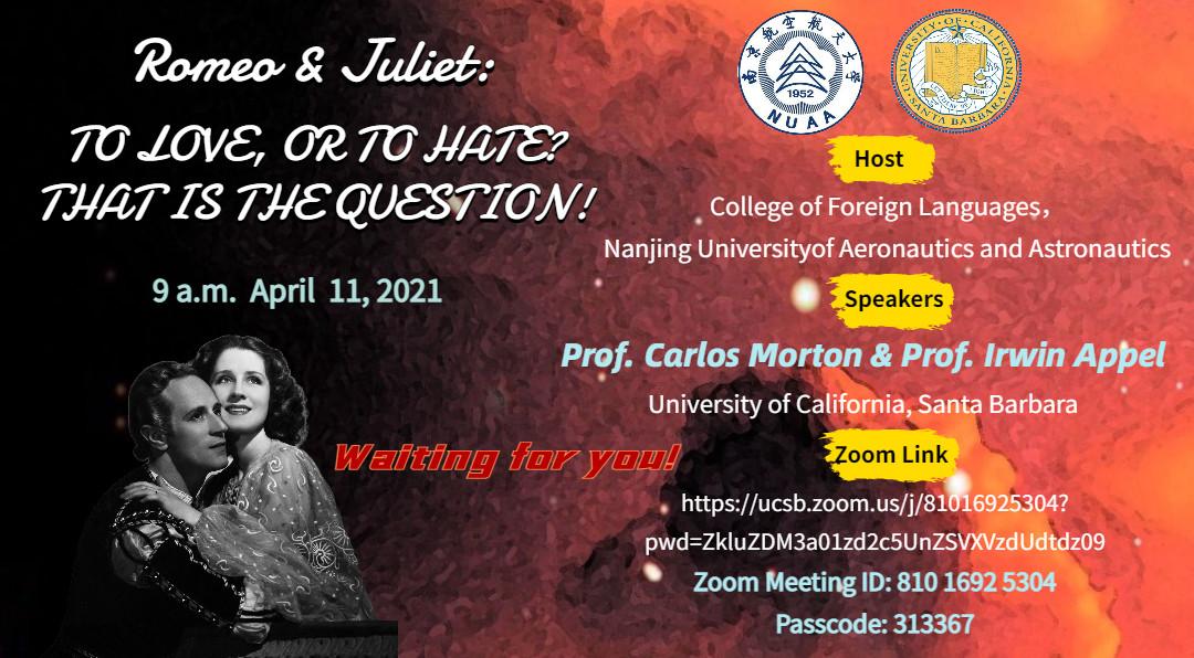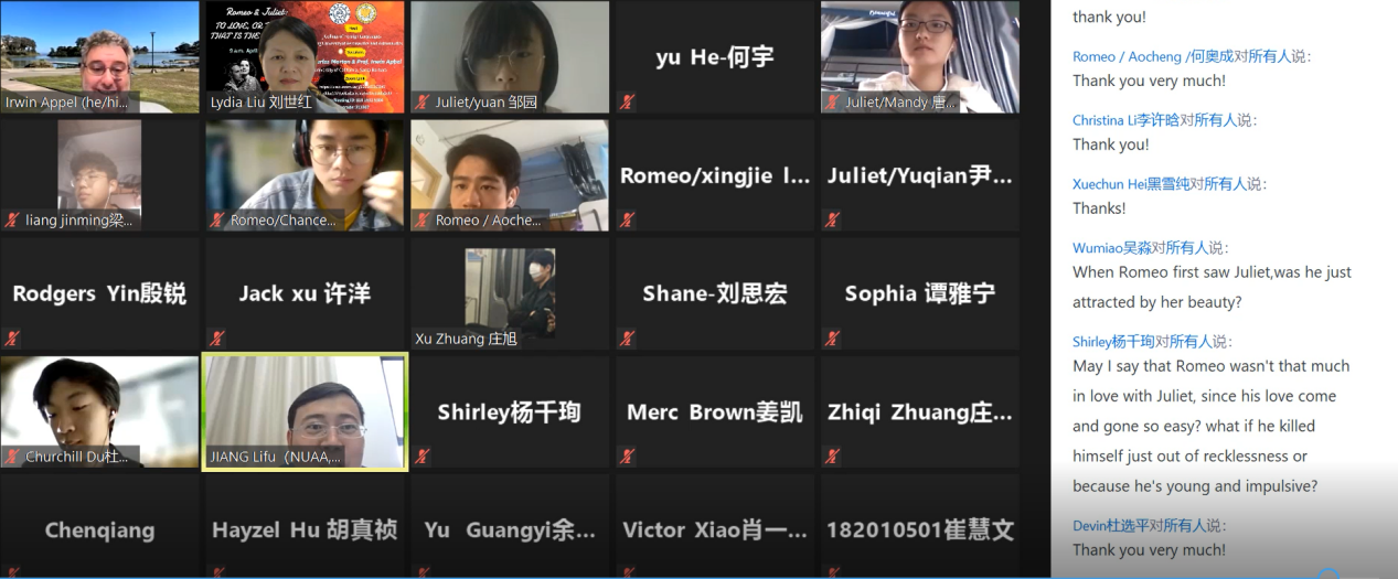 本次讲座共分为两个环节,由星空影院 国际联络中心主任、刘世红副教授主持。在第一环节中,加州大学圣巴巴拉分校戏剧教授Irwin Appel从自己的研究和实践情况出发,和同学们分享了人物角色、人物关系、故事背景、情节设置和台词意义等方面的相关知识。教授还结合《罗密欧与茱丽叶》中的情节介绍了戏剧中的各要素,如主角、情节、反面角色、事件、矛盾冲突、高潮等。随后,教授和同学们针对《罗密欧与茱丽叶》剧情相关的问题进行了热烈讨论,而Irwin Appel教授针对同学们的问题进行了一一解答,向同学们展示了自己的见解。在第二环节中,身为演员的Appel教授通过对比不同背景音乐、变换语气语调,亲自朗诵了《罗密欧与茱丽叶》中的经典台词和独白,并指导同学们对其中的精彩片段进行了演绎和表演。随后,Irwin Appel教授启发同学们围绕莎士比亚戏剧的表达思想以及《罗密欧与茱丽叶》的悲剧内核展开了热烈的讨论,与会的师生们通过会议软件聊天室、或者开麦提问,气氛活跃,互动精彩纷呈。讲座的最后,星空影院 副院长姜礼福老师对讲座进行了总结,高度评价了Irwin Appel教授讲座的学术价值,并邀请Irwin Appel教授未来到我校开展更多更深入的合作交流。