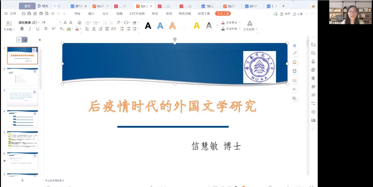 信慧敏在讲座中,以“后疫情”这个关键词切入,探讨了新冠疫情对外国文学研究的影响,并从“文学何为”“何为文学研究”“文学研究如何开展”“文学研究新趋势”等方面开展。信老师认为,新冠疫情的重要启示之一,是要求文学研究者更关注社会现实,疫情依然是当今世界的重要改变了全球范围内的政治、经济、文化面貌,需要在新的社会语境下,发掘文学作品对形塑现实的影响。信老师结合英国著名作家笛福的小说《猩红疫》,通过对疫情爆发后的惨烈情景的分析,探讨了灾疫小说的伦理内涵,提出了全球构建人类命运共同体的重要意义。讲座最后,分享了空间、叙事学、创伤等外国文学研究最新趋势。