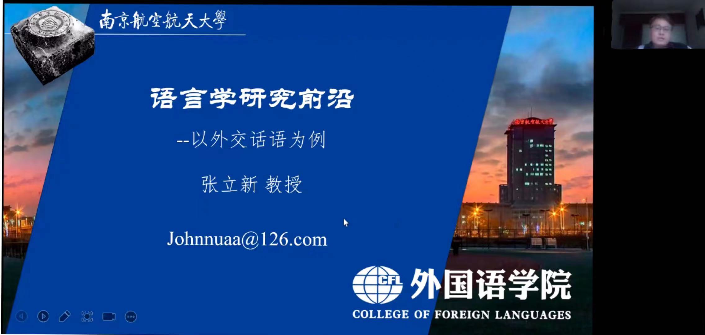 张立新的讲座从“前沿的理论”“前沿的方法”“前沿的问题”“前沿的对象”等四方面开展。张老师结合自己国外访学经历,分享了自己的研究兴趣,认为语言学研究要呼应社会现实和社会需求。然后,张老师结合中美社交媒体中的中国国家形象建构、外交话语隐喻认知叙事构型及其话语秩序研究等为例,分析了疫情背景下,中美两国在外交话语运用上的鲜明特征和差异性,认为这对于建构国家形象产生着重要影响,并提出相应的建议。
