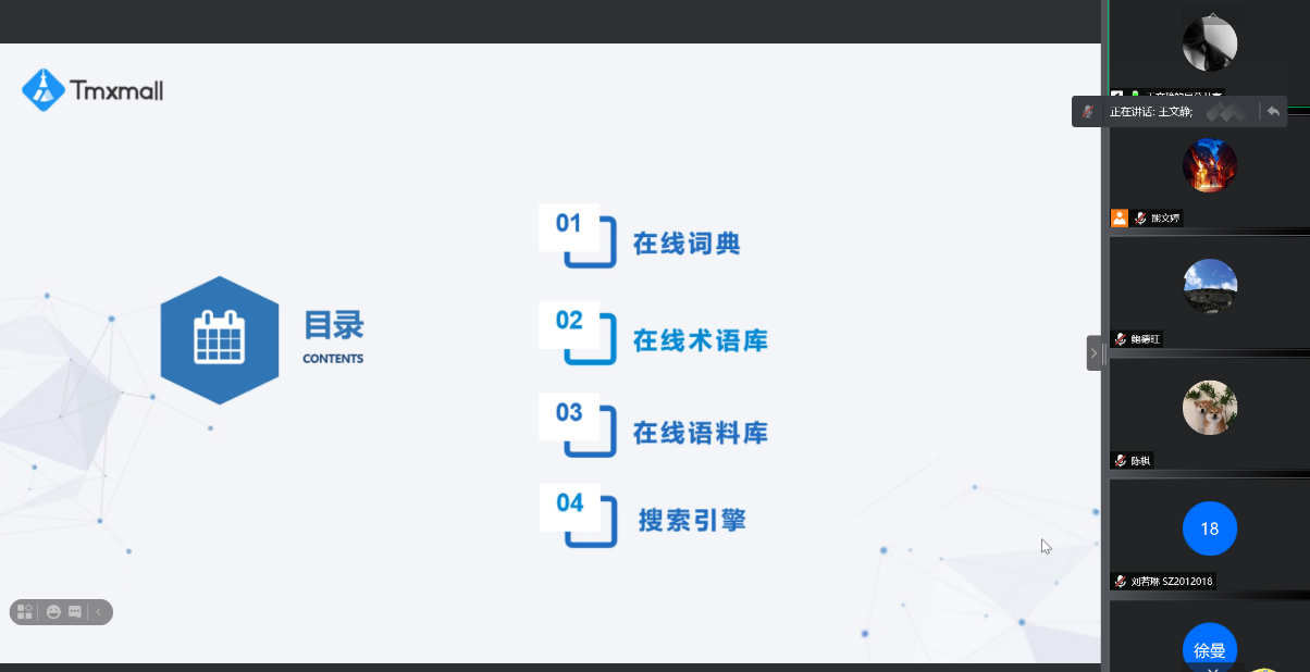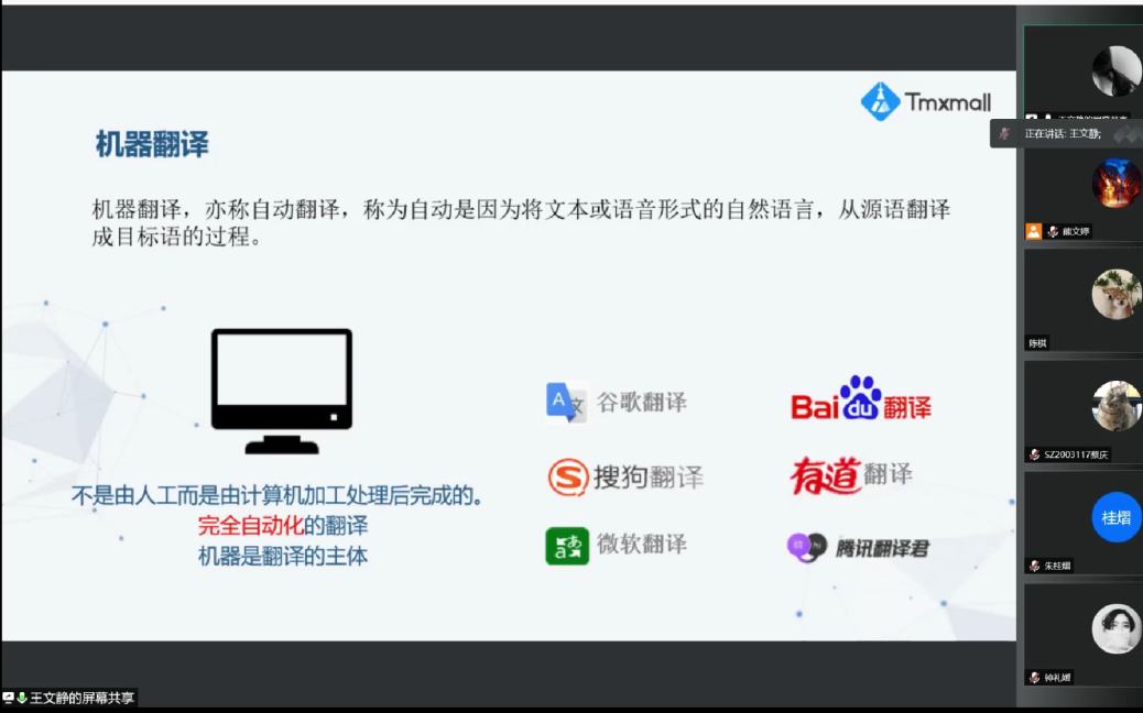 7月8日晚7点,上海一者信息科技有限公司高级运营经理王文静应星空影院 邀请,为20级MTI研究生带来了一堂精彩的线上讲座。王经理曾参与多个大型特色语料库建设项目,擅长语料库的生产制作及检索分析,并熟悉各类主流计算机辅助翻译工具实践应用,本次她带来的讲座主题为“信息检索与机器翻译译后编辑”。