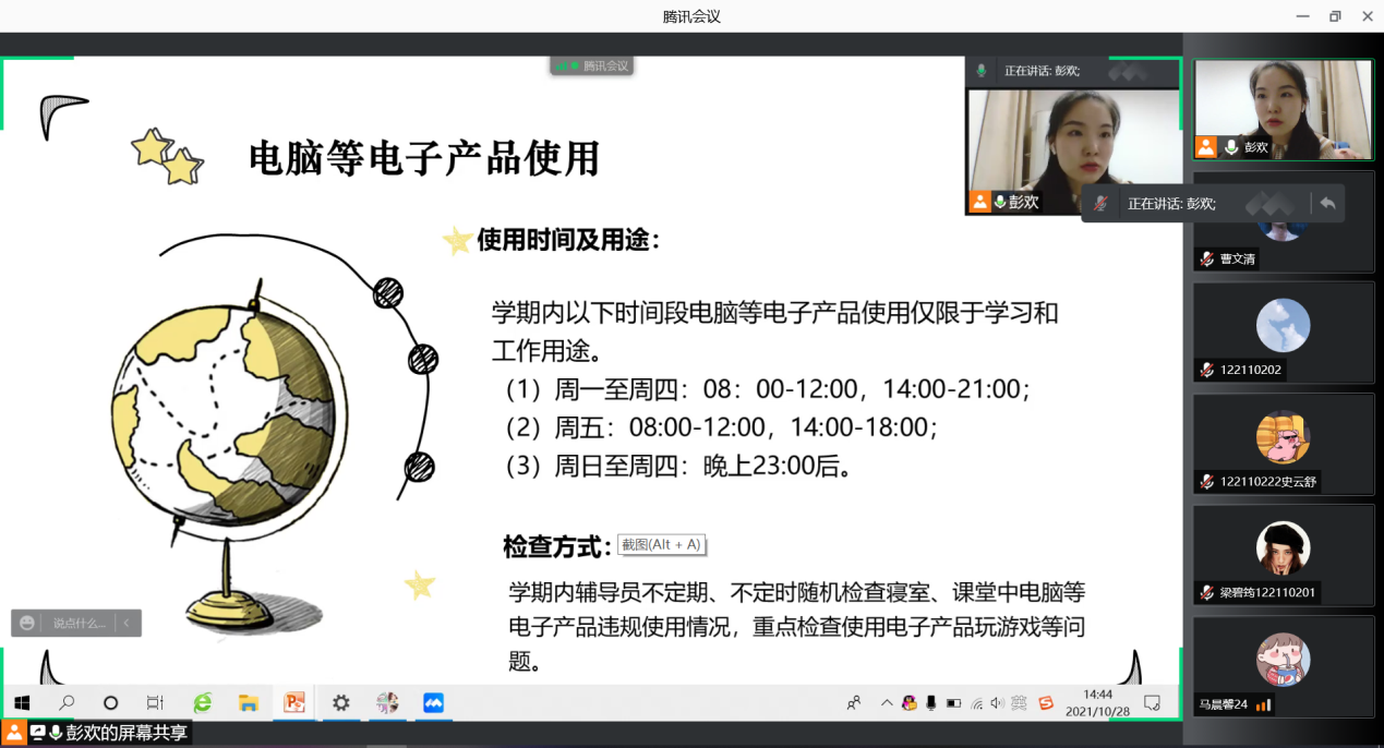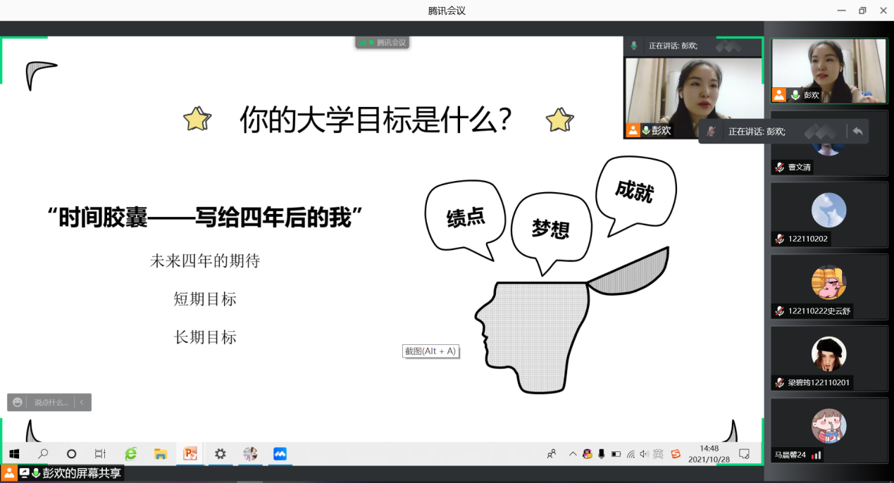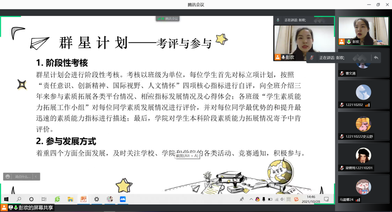 为了增进大一新生对校院制度及“群星计划”学生素质拓展平台的了解,更好地帮助新生们适应大学生活, 10月28日下午,星空影院 在线上腾讯会议平台召开了2021级本科新生“群星计划”主题年级会。2021级本科生辅导员彭欢、兼职辅导员曹文清,2021级全体新生参加会议,会议由彭欢主持。