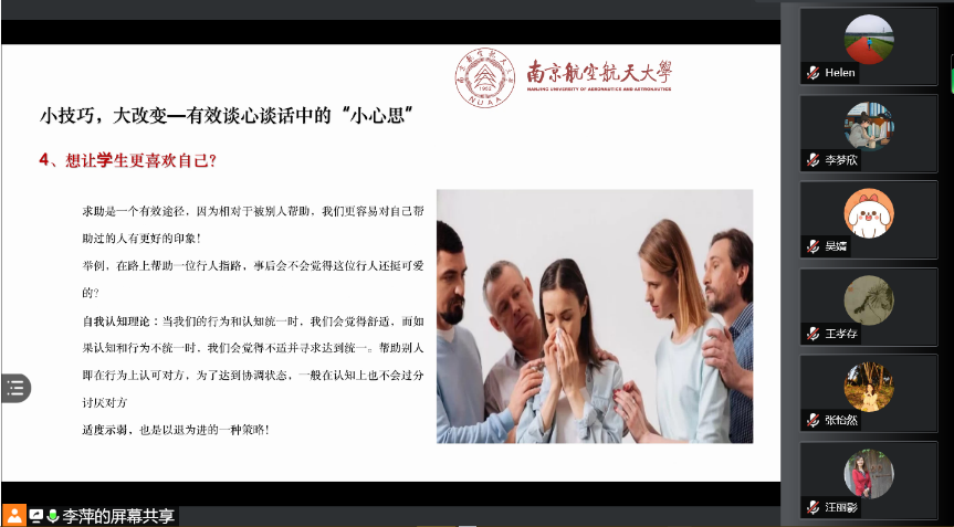 为落实党史学习教育“我为群众办实事”,扎实开展学校研究生“谈心谈话关爱月”工作,帮助老师们更好掌握跟学生谈心谈话技巧,有力推动和谐良好导学关系,11月19日学院线上开展了面向全体教师的心理工作坊第二期——谈“谈”心之道,培训由研究生辅导员李萍主讲。