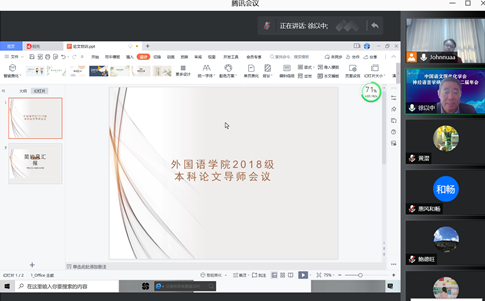 举办了2018级本科论文导师线上培训会议。英语系主任张立新教授主持会议,院长范祥涛教授、副院长徐以中教授、姜礼福副教授、学院督导组长谢小苑教授及教学办老师、英日语专业论文指导教师参加了会议。