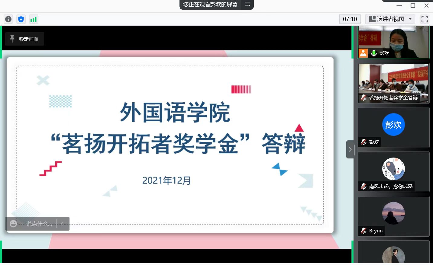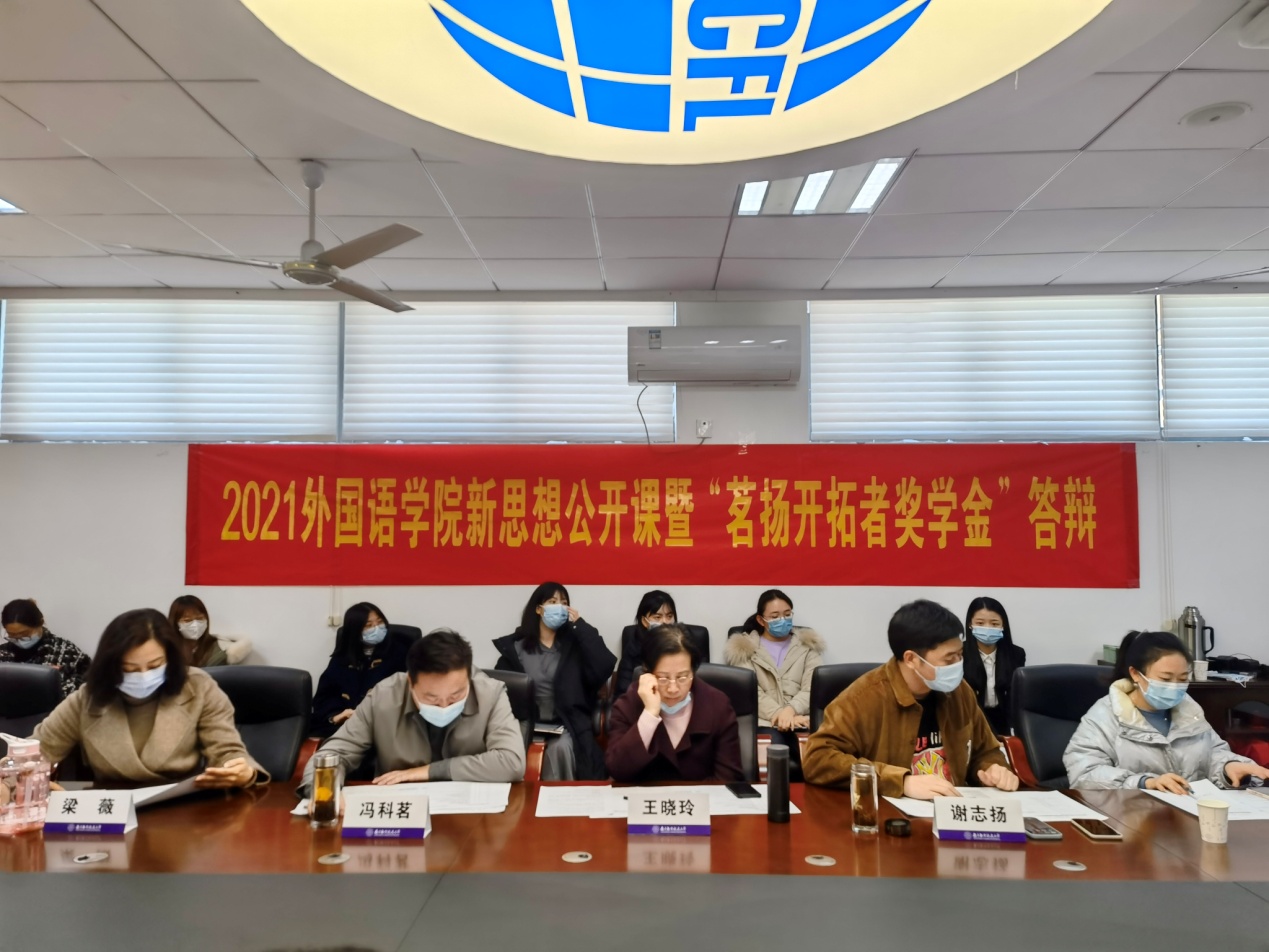 党委副书记梁薇、英语系副教授王晓玲、院团委书记李萍、本科生辅导员盛嘉贤、本科生辅导员彭欢出席答辩会。本次答辩会由上届“茗扬开拓者奖学金”一等奖获得者肖依雪主持,全体本科生通过腾讯会议进行线上观摩学习。