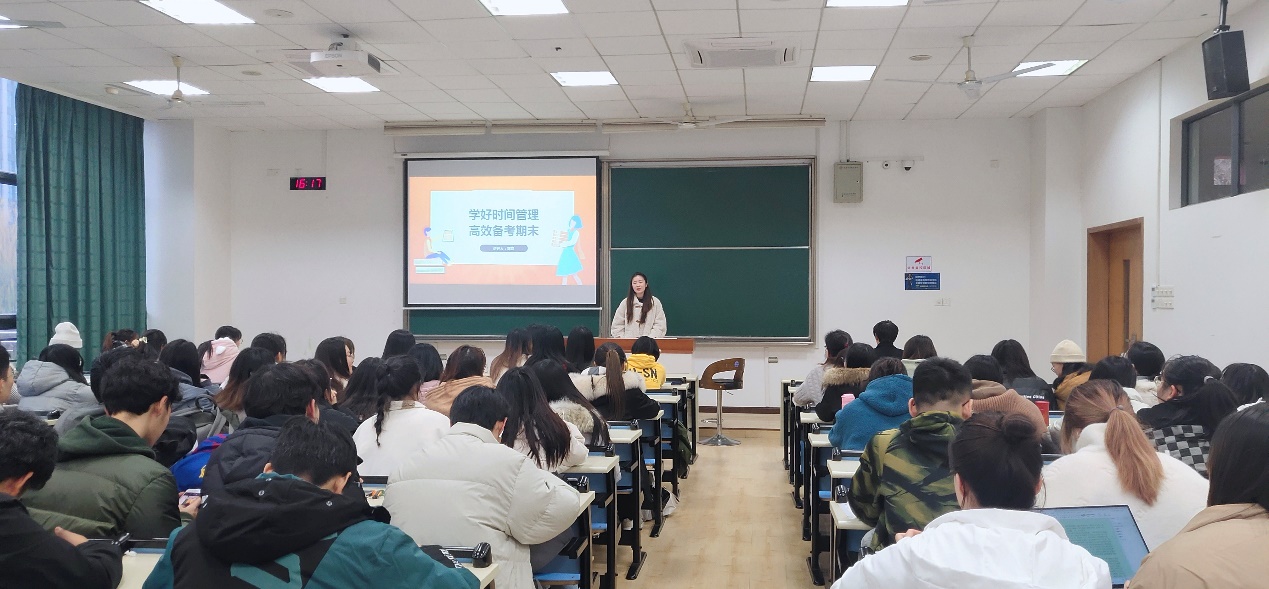 首先,郑怡针对大二同学在期末复习中缺乏时间管理的痛点,从“为何无法做自己时间的主人”及“如何高效管理时间”出发,结合前期《时间管理与期末复习难题》调研问卷,引导同学们克服无法管理好时间的心理因素并介绍科学的时间管理方法,帮助树立良好的时间管理意识,有效进行期末复习规划。