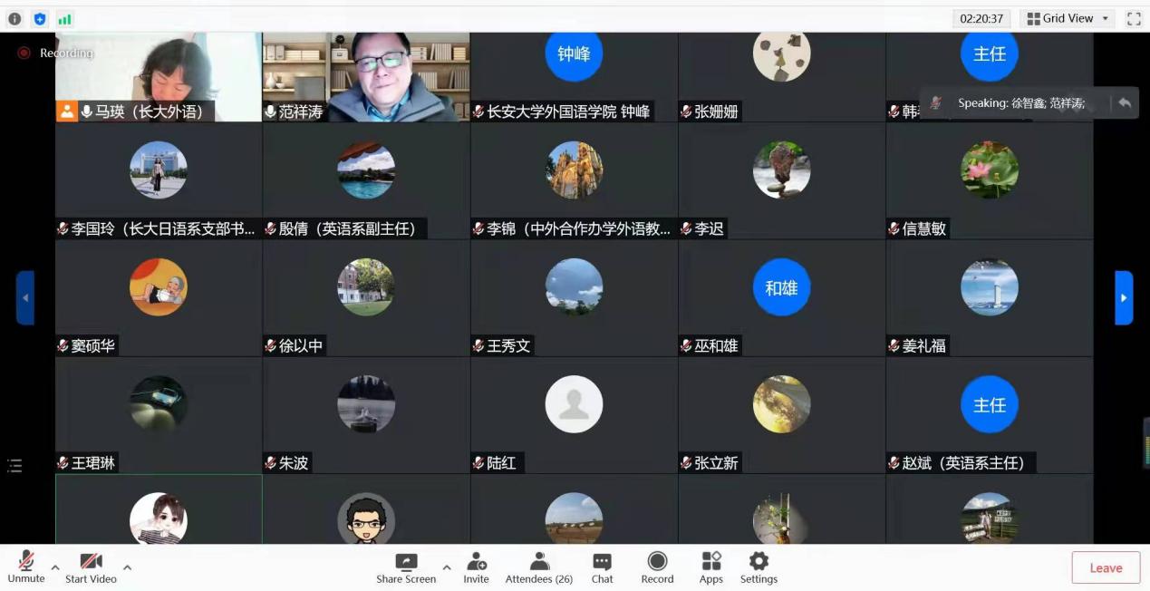 本次会议由徐以中副院长和长安大学星空影院 马瑛副院长联合主持,会议围绕外语新文科建设的总体目标、课程体系、专业方向等展开讨论,对授课内容、教材、方法提出具体方案,探讨了交叉学科建设亟待解决的教师发展和人才培养等问题。
