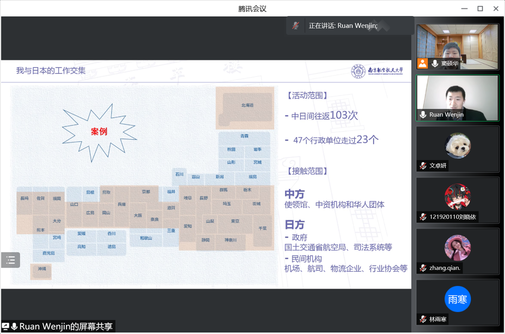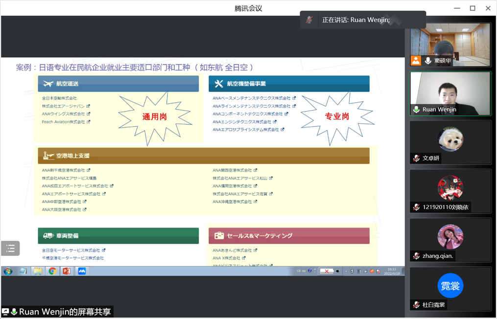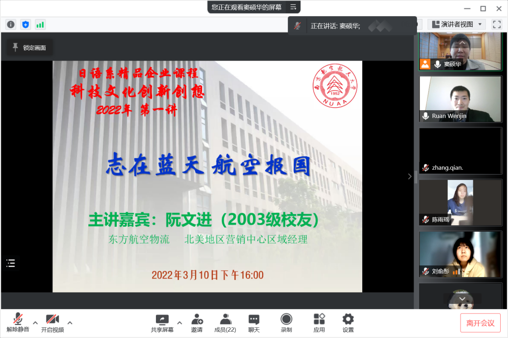 3月10日下午4:00,星空影院 日语系科技文化创新创想课程2022年度第一讲通过腾讯会议成功进行,主题为《志在蓝天,航空报国》。主讲嘉宾为03级日语系校友阮文进,现任东方航空物流北美地区营销中心区域经理。