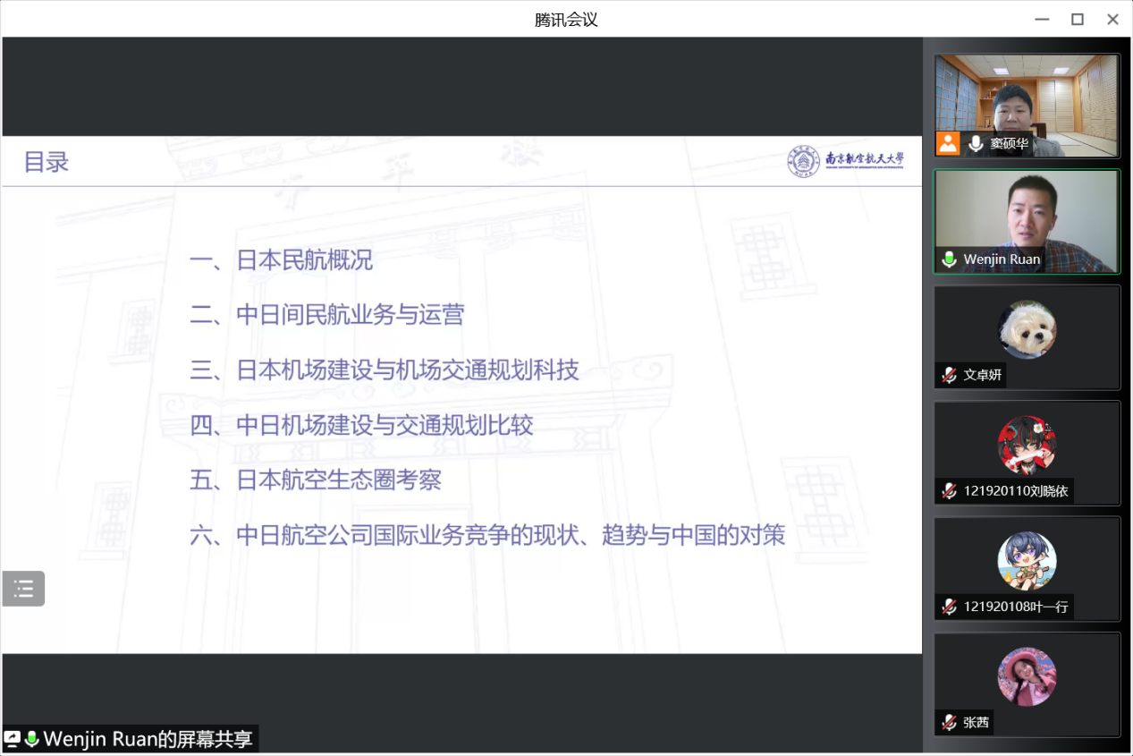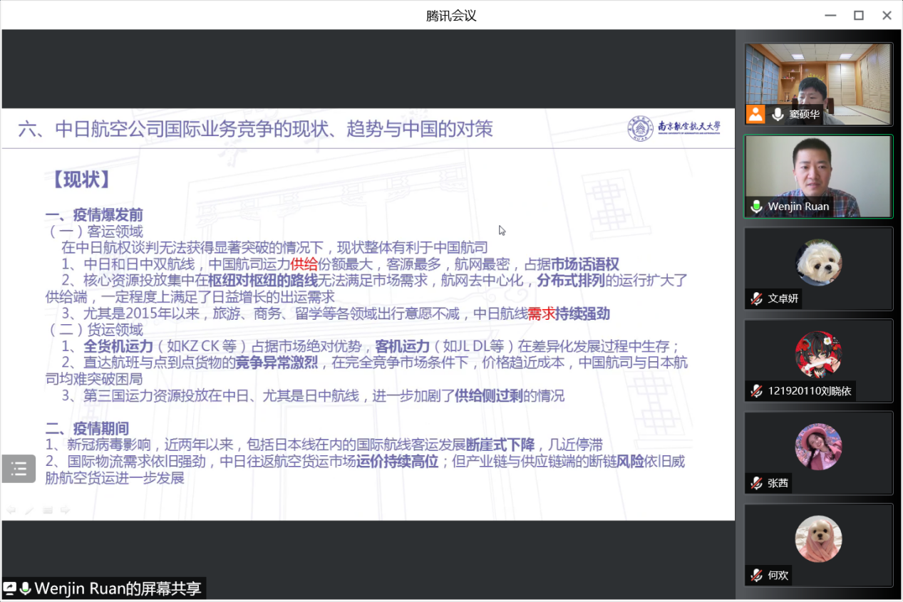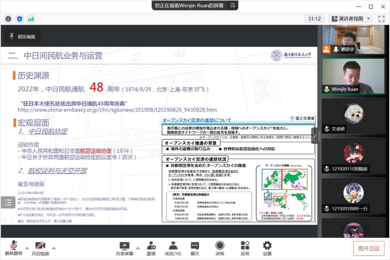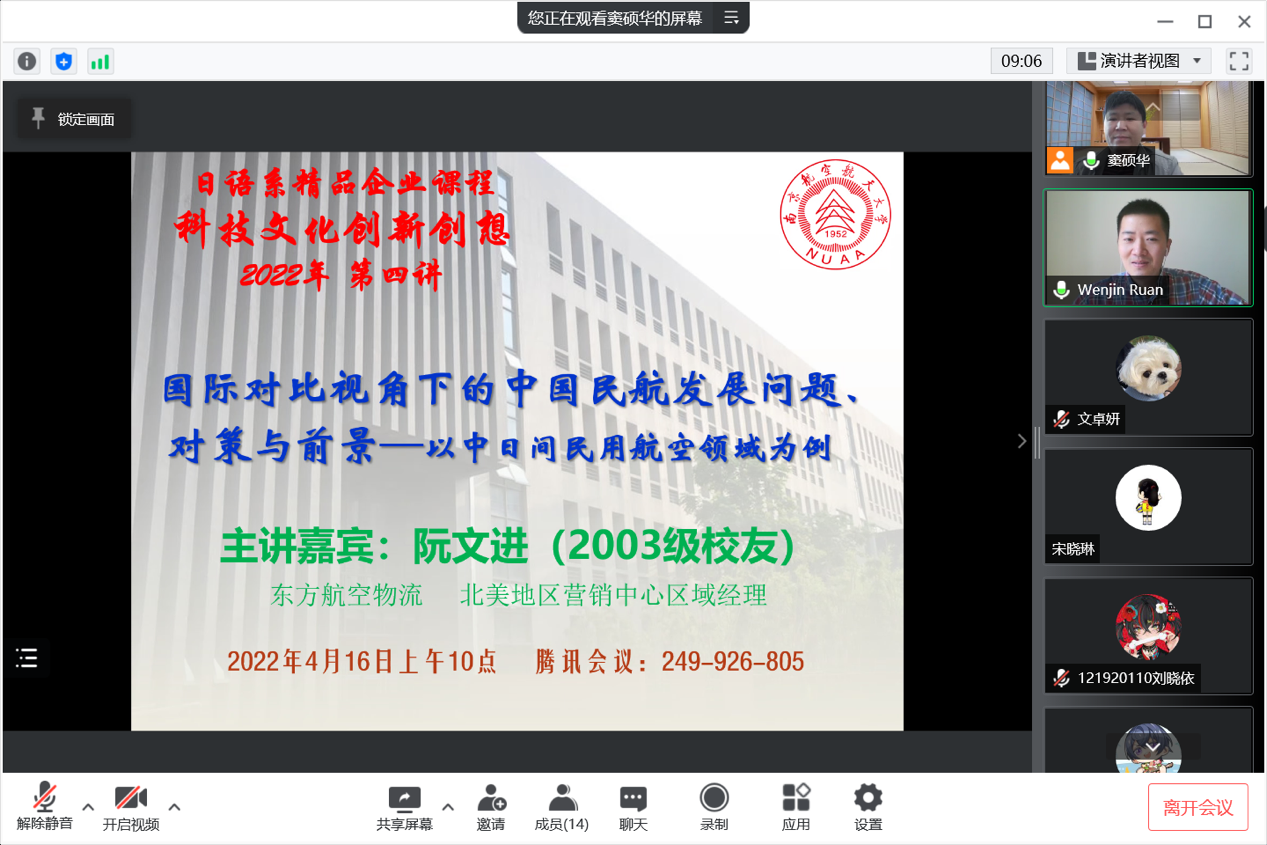 4月16日上午10点,星空影院 日语系精品企业课程《科技文化创新创想》2022年度第四讲通过腾讯会议成功进行,本次主题为《国际对比视角下的中国民航发展问题、对策与前景——以中日间民用航空领域为例》。主讲嘉宾为03级日语系校友、现就职于东方航空物流北美地区营销中心的阮文进经理。