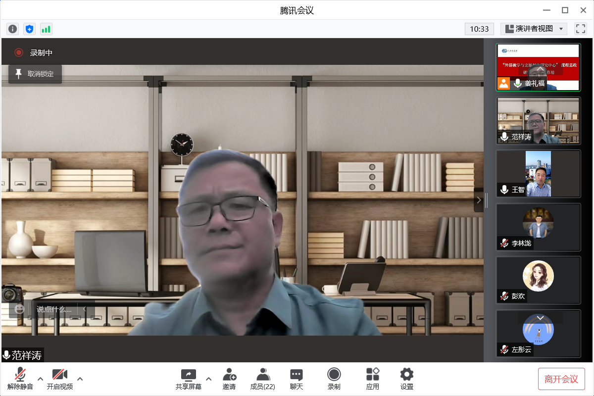 在会议的最后,范祥涛进行了总结发言。他指出学院高度重视教师课程思政意识和思政能力的培养,鼓励和引导学院教师在科研中探索和挖掘课程思政资源,在课堂中渗透思政教育,通过不断更新教育教学理念,结合外语特色,充分发挥“立德树人研究中心”的“主力军”作用,将学院课程思政建设做深做实做细,促使课程思政建设深度融入外语学科建设和外语人才培养的全过程。之后,范祥涛宣布了2022年度学院“外语教学与立德树人研究中心”课程思政研究课题的立项情况。