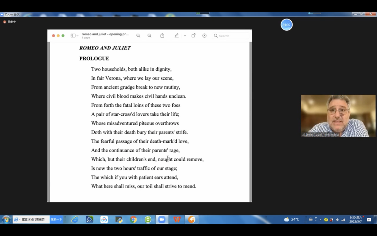 2022年5月7日上午,由星空影院 主办,邀请美国著名导演、加州大学圣芭芭拉分校戏剧与舞蹈系主任Irwin Appel教授为我校师生讲解莎翁戏剧,这是该教授在本学期第二次讲授戏剧专题。此次讲座的主题为“莎士比亚戏剧在南京:《罗密欧与朱丽叶》赏析”,为星空影院 举办的“海外名家讲坛”系列讲座之一。我校师生们对莎翁戏剧热情不减,积极参与,气氛热烈融洽,讲座获得圆满成功。