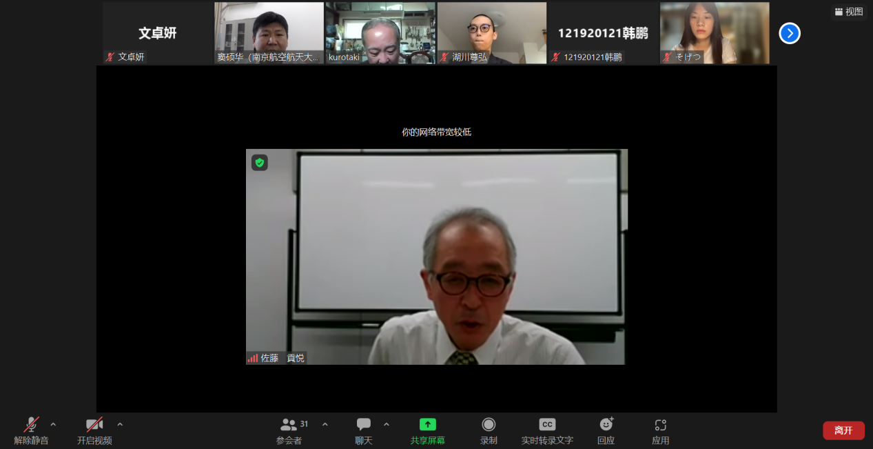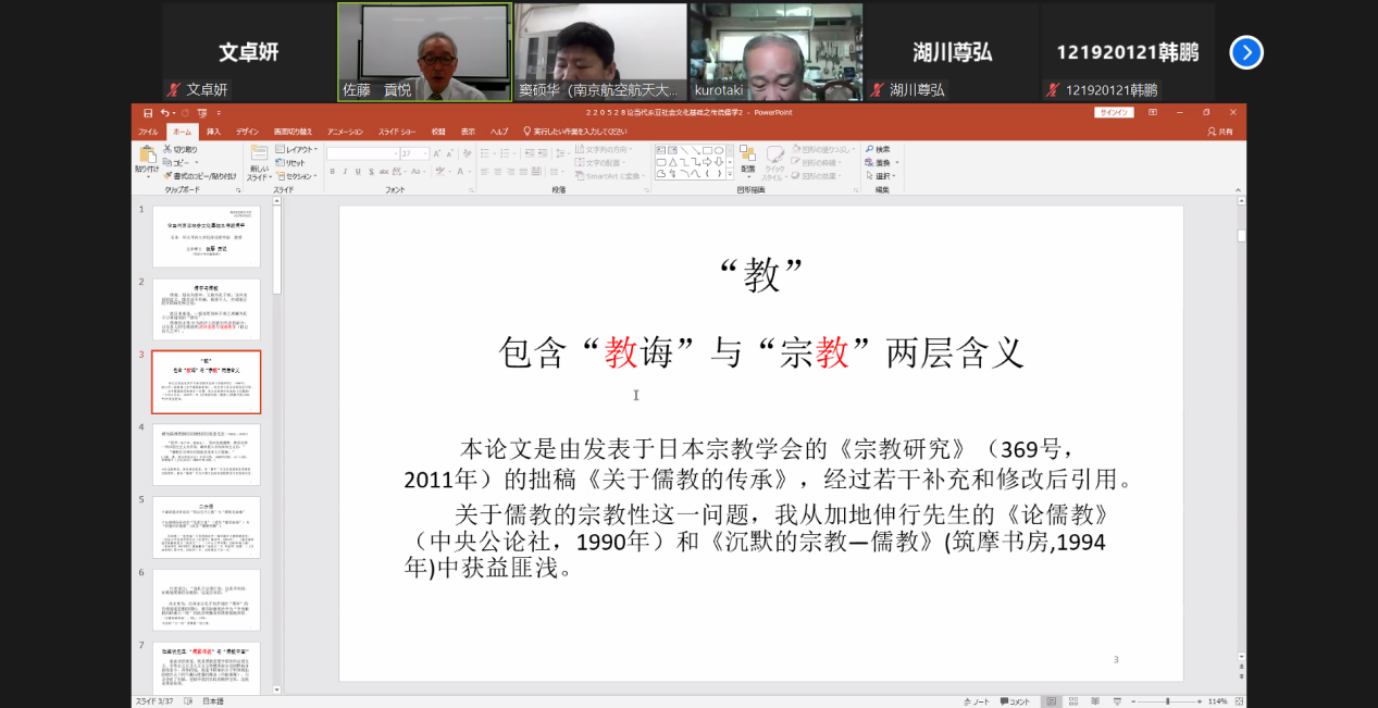 5月28日(周六)上午9:00,星空影院 日语系海外名师讲坛第一讲通过线上ZOOM会议成功进行,主题为《現代東アジア社会の文化的基礎としての伝統儒学》。主讲嘉宾为环太平洋大学教授・筑波大学名誉教授佐藤贡悦。讲座由日语系主任窦硕华老师主持,外专项目领衔人・东京农业大学黒瀧秀久教授和南航日语系40余名同学参加了讲座。