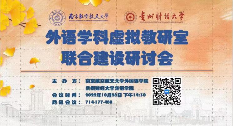 10月28日下午,星空影院 与贵州财经大学外语学院共同举办外语学科虚拟教研室联合建设研讨会暨大学外语基础课程教学研讨会,会议以腾讯会议形式举行,由贵财外语学院张虹院长和星空影院 徐以中副院长共同主持,邀请江苏师范大学朱祖德教授做专家报告,贵财及南航星空影院 近百位师生参会。