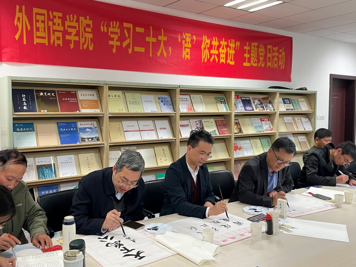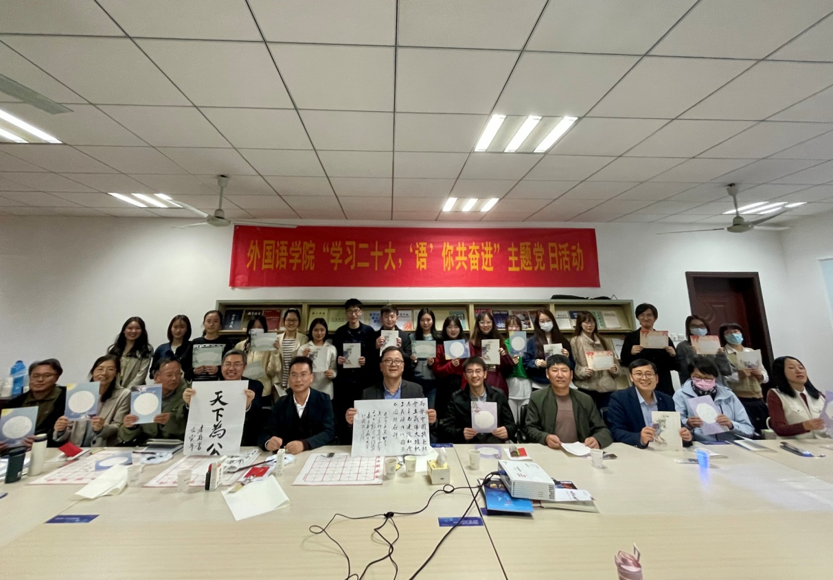 活动最后,全体党员以软笔、硬笔书法的形式抄录党的二十大报告金句,献礼伟大祖国。大家有的用钢笔在印有祖国山河的画卷上书写对祖国的美好祝福;有的则提起毛笔,用饱含深情的书法祝福祖国的伟大事业和光明前景。星空影院 院长范祥涛还为活动题写了寄语,希望师生们努力奋进,建设更加强大繁荣的祖国。