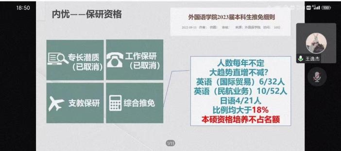 会议伊始,学院2019级本科生王逸杰、魏嘉、文卓妍围绕保研,进行了经验分享。王逸杰从保研的前期准备到保研的整个过程进行了详细的讲解,希望学弟学妹们不忘初心,保持热爱;魏嘉通过路径选择等多个方面,引导学弟学妹们提前思考自己的未来规划,找到适合自己的方向;文卓妍详细介绍了保研流程,希望学弟学妹在口语练习方面,提前进行有针对的练习。