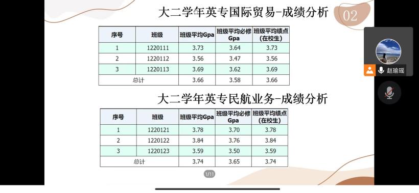 随后,赵瑜瑶对2020级大二学年成绩作总结分析,通过班级间的比较,从平均绩点、绩点分段、各科成绩最高分等方面帮助学生找差距、补短板。鼓励所有学生都要保持学习的动力和热情,做好规划,再接再厉。同时,也希望同学们尽早思考未来的发展方向,先人一步,早做规划。