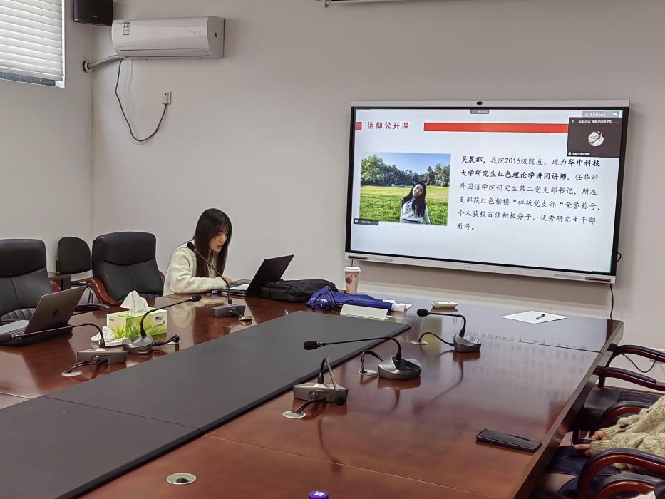 为深入学习贯彻党的二十大精神,11月15日,星空影院 团委与华中科技大学红色理论学讲团开展联学共建,邀请学讲团讲师吴晨郡主讲信仰公开课,公开课由学院2021级学硕研究生团支部书记言声远主持,学院2020级、2021级研究生团支部参与。