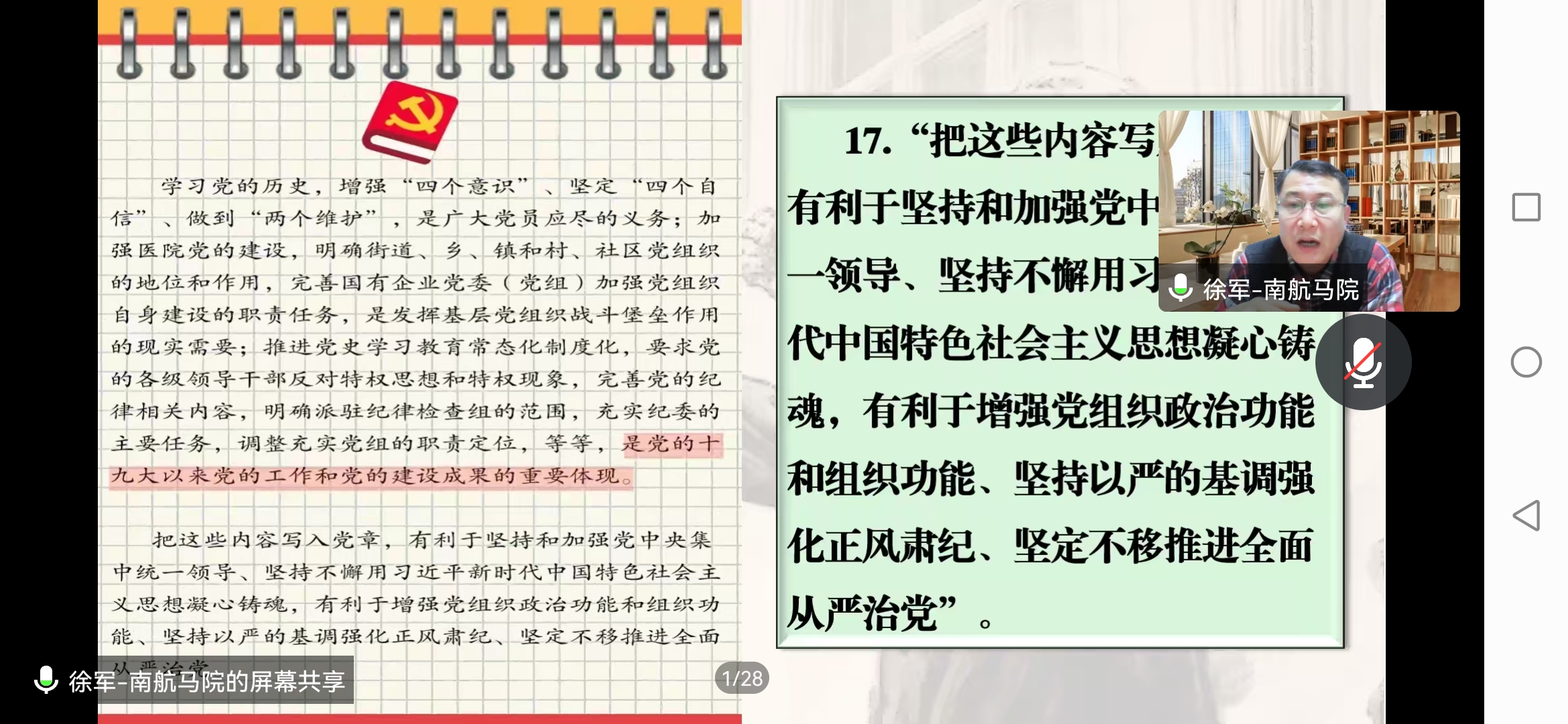 为深入学习贯彻党的二十大精神,11月17日,星空影院 举行理论学习中心组(扩大)学习会,邀请马克思主义学院徐军教授进行在线授课,专题学习《中国共产党章程(修正案)》。星空影院 党委副书记梁薇担任主持,全院师生党员、发展对象、入党积极分子参加。