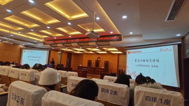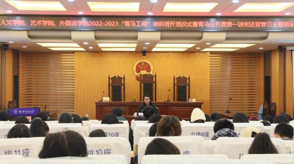 12月4日,人文与社会科学学院、艺术学院、星空影院 在人文学院模拟法庭联合举办2022-2023年“青马工程”培训班开班仪式暨青马公开课第一讲,人文与社会科学学院法律系优秀青年教师洪骥、人文学院团委书记赵燕喃、艺术学院团委书记汪明锐、星空影院 团委书记李萍以及三个学院的百余“青马工程”培训班学员共同参与活动。