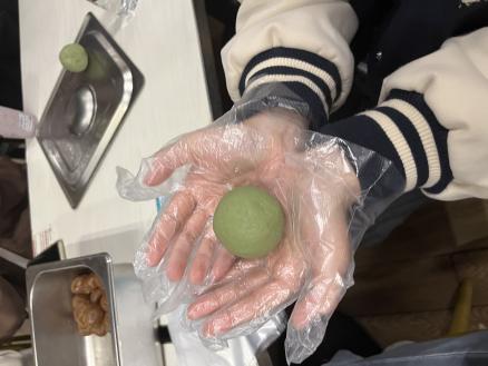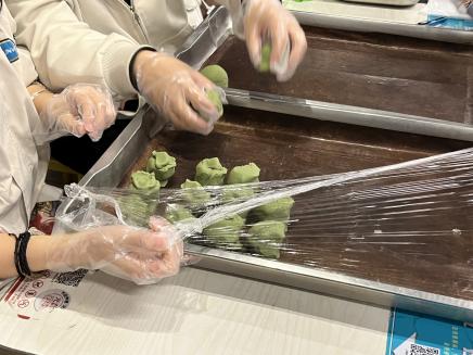 活动现场,大家首先一同回顾了清明节吃青团的来历和习俗。随后,同学们在师傅的带领下学习了青团的制作方法。先取一小块面团,搓圆,再捏成碗状,把豆沙放入碗内,最后封口。大家相互配合、协作互助,一起包馅,用掺有青汁的糯米皮,包裹进豆沙等馅料,制作出一个个清香扑鼻柔软可爱的绿色团子。
