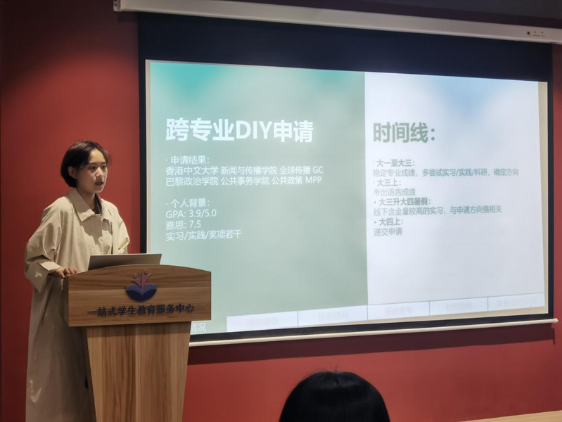 武思彤同学先后获得了香港中文大学新闻传播学院全球传播方向的录取通知书和巴黎政治学院公共政策的录取通知书,并且具有较为丰富的实习实践经历。她对留学申请的前期准备、申请流程以及申请中的注意事项为同学们作了详细的分享。