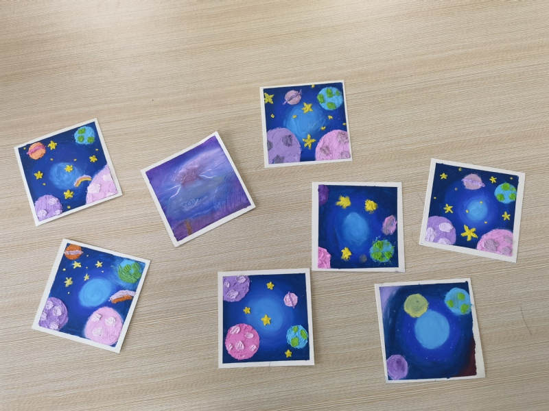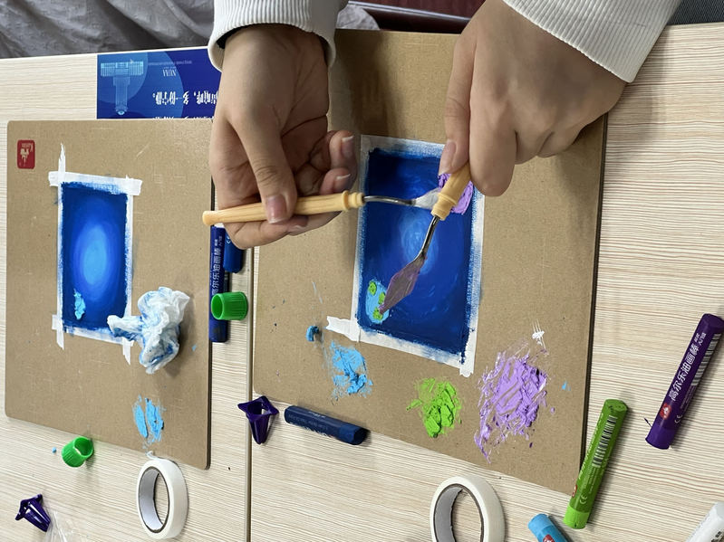 在学习完水彩绘的流程之后,同学们围在长桌旁,尽情发挥想象力与创造力,开始了自己的创意之旅,一笔一画的勾勒,缤纷多彩的图案,同学们用笔尖表达对南航的喜爱。从耐心倾听小老师的双语讲解到认真思考、动手制作,每位同学都亲手描绘出了属于自己的最独一无二的“蓝色星球”。