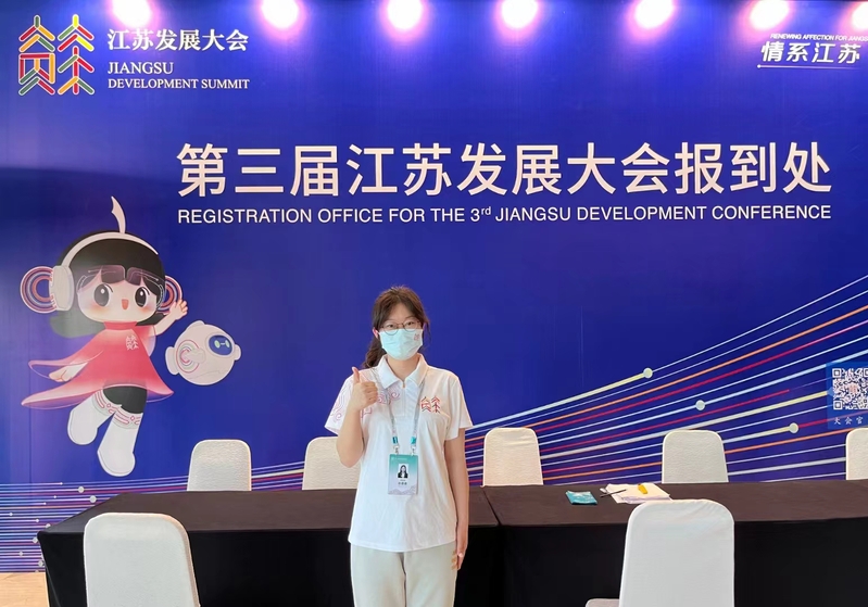 情系江苏,共筑梦想,非常荣幸能够加入到江苏发展大会的志愿服务工作中来。在前期的培训中,我们认真学习与演练各类礼仪与应急知识;在实际志愿服务工作中,我与同学们共同协作,帮助工作人员及到场嘉宾完成相关报到工作。我也非常幸运能够在实际志愿服务工作中,发挥专业特长,完成了一对一的外宾陪同翻译工作,提升我的专业实践能力。在未来,我也会继续努力,为“强富美高”新江苏现代化建设贡献自己的青春力量!
