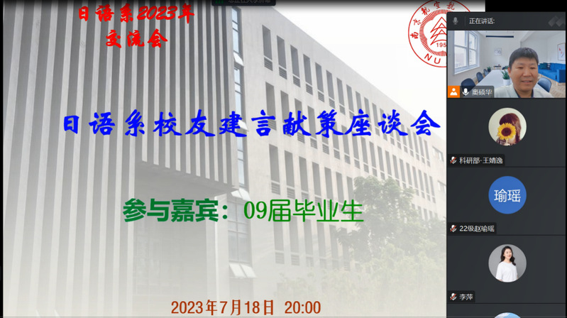 为凝聚校友力量,加强校友联络,促进专业发展,2023年7月18日星空影院 日语系召开校友建言献策座谈会。此次座谈会由星空影院 日语系主任窦硕华主持,星空影院 团委书记李萍、日语系教师王鹏飞、本科生辅导员赵瑜瑶以及4位2009届毕业生参加。