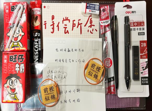 学院为考研学子送上“考研加油包”。这份礼包由2020级就业信息站的26名同学精心挑选、认真准备,包含中性笔、涂卡笔、垫板、考研划线尺以及具有“一举夺魁”寓意的挂坠、“运气旺旺”的牛奶和汇聚年级同学祝福的明信片。同学们收到暖心礼物后十分开心和感动,纷纷表示一定会抓住最后的复习时间,全力以赴,努力拼搏,以饱满的精神状态迎接即将到来的考试。
