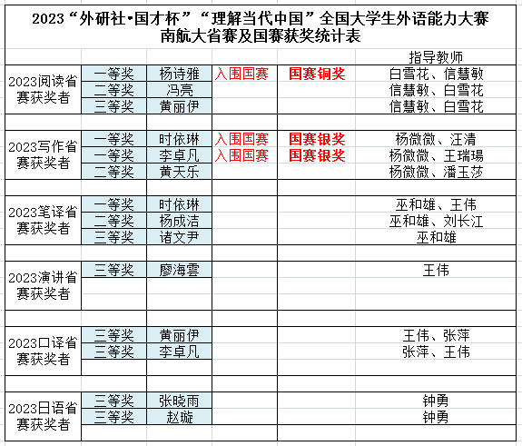 近日,2023年外研社国才杯“理解当代中国”全国大学生外语能力系列大赛落下帷幕,我校选手在星空影院 竞赛团队教师的精心组织和指导下取得了骄人的成绩,其中全国总决赛3项获奖,江苏省复赛获奖14项。