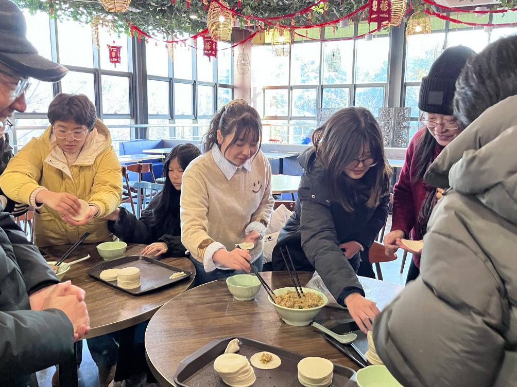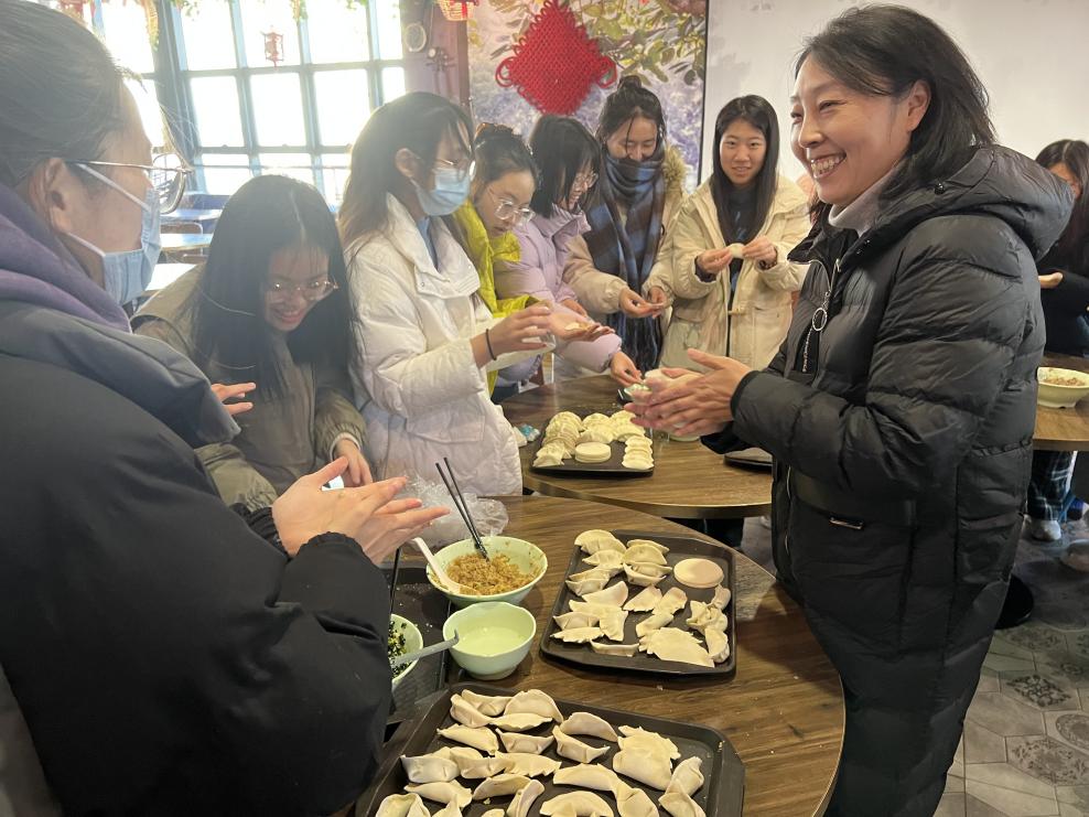 随后,各位老师与同学们共同着手包饺子,体验冬至节气的习俗。大家互相学习、交流包饺子的技巧,分享各自的家乡特色。师生分工协作,配合默契,现场欢声笑语,其乐融融。