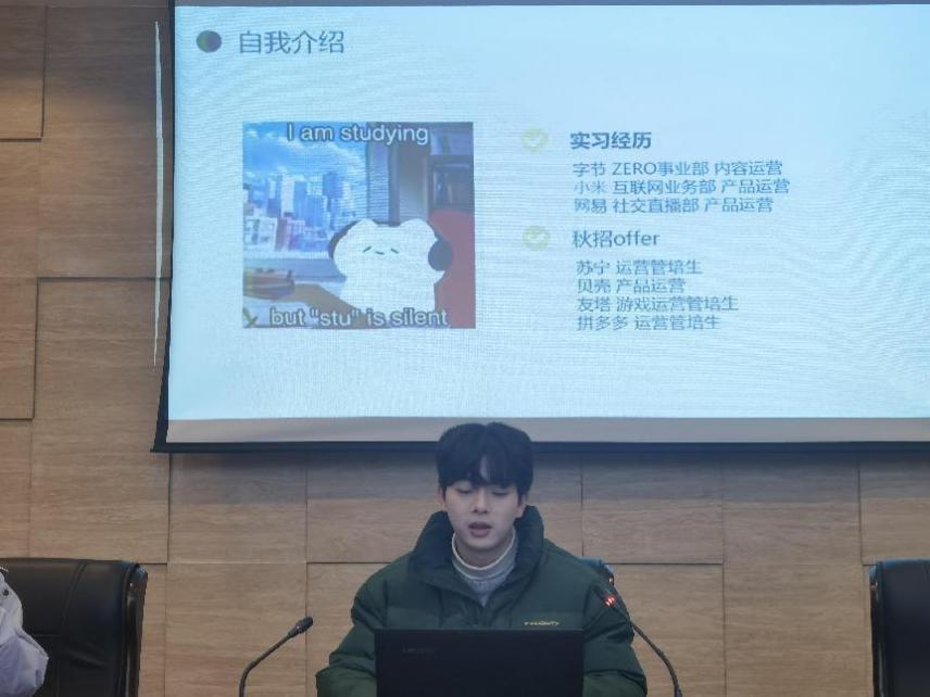 刘楠重点讲述了自己多家互联网公司实习经历、以及成功拿到小米Offer的过程,建议同学们在准备简历时要重点突出自己的优势,同时要利用好学校、学院的资源优势,把握好每次实习机会。